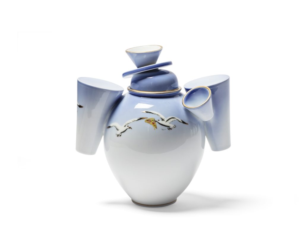 - Michael Geertsen, Lidded porcelain vase with Seagull and pizza slice decoration, 2025. Underglaze decoration by Bente Petersen. Overglaze decoration by Marlene Jørgensen. Courtesy of Michael Geertsen/Royal Copenhagen