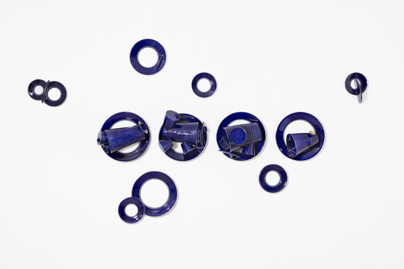 - Michael Geertsen, Blue Bubbles, 2025, 15 parts, earthenware with blue glaze and platinum lustre, ~17-32 cm.