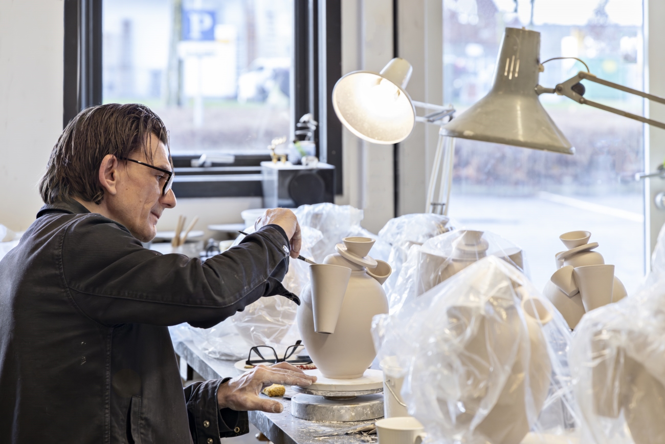 - Michael Geertsen working on a series of new jars produced for the exhibition at Royal Copenhagen in Glostrup.