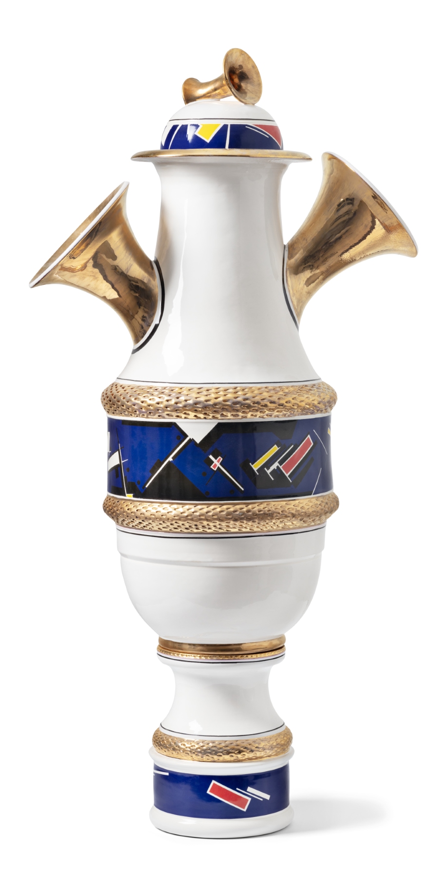 - Michael Geertsen, Ornamental vase with trumpets, 2024, Earthenware with white glaze, decals, and gold with platinum lustre, H 98 cm.