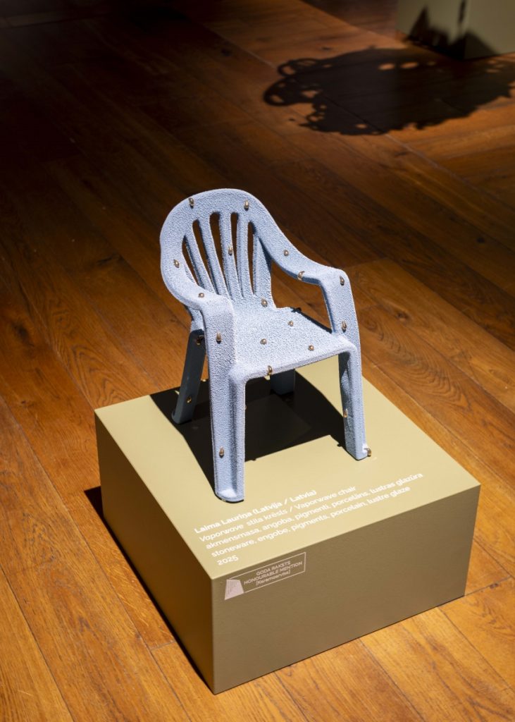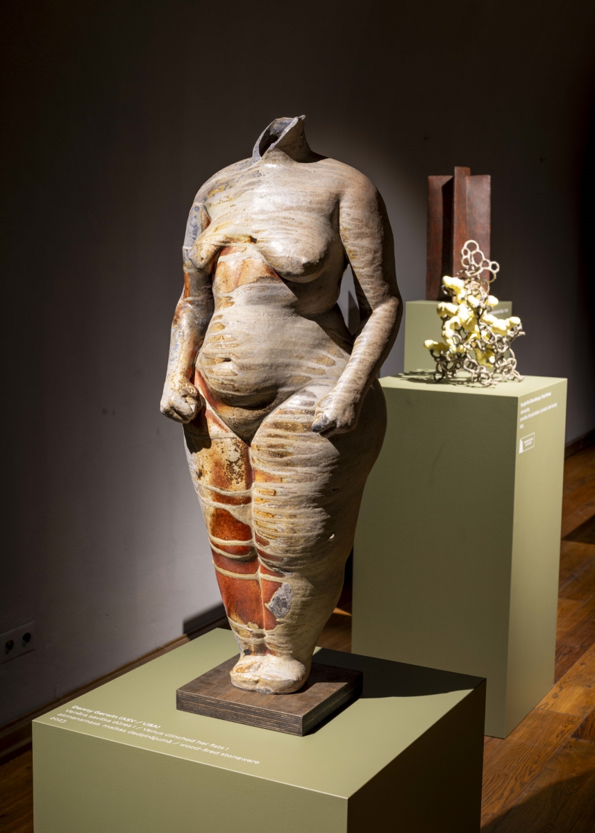 The 5th edition theme, From Stardust to Lush Sprouts, embraces the journey from primordial beginnings towards further development – much like the creative process from idea to physical form. According to the curators (Valentins Petjko and Aivars Baranovskis), it also reflects clay as a material that has accompanied humanity from its origins, first as a fundamental tool for development and later as a medium for artistic expression. This transformation from primal imagery to contemporary contexts — including feminist narratives and the depiction of woman as a creator of the universe (inspired by Marija Gimbutas’ archaeomythological research) — can be seen in the work of U.S. artist Denny Gerwin. His Venus is a depersonalised and furious (yet restrained) female figure. Simple chamotte clay combined with wood firing references ancient cultural foundations, while the clearly expressed, declarative pose of the hands signals resistance to persistent gender stereotypes.