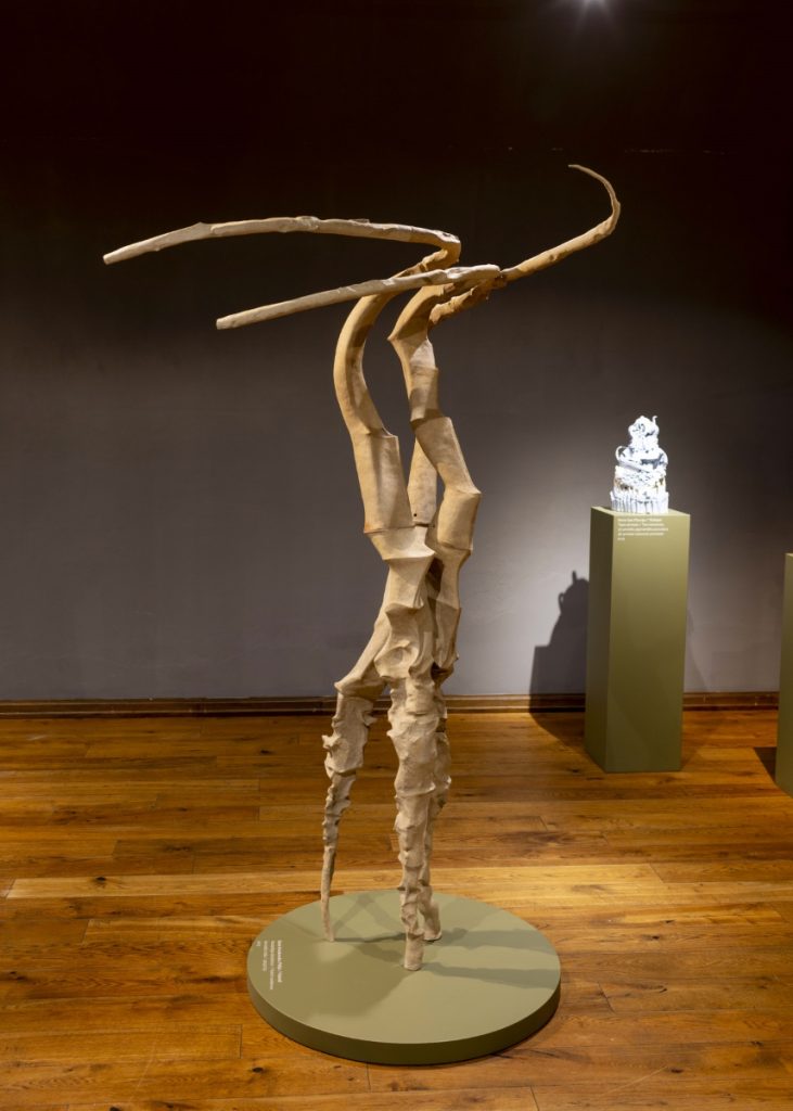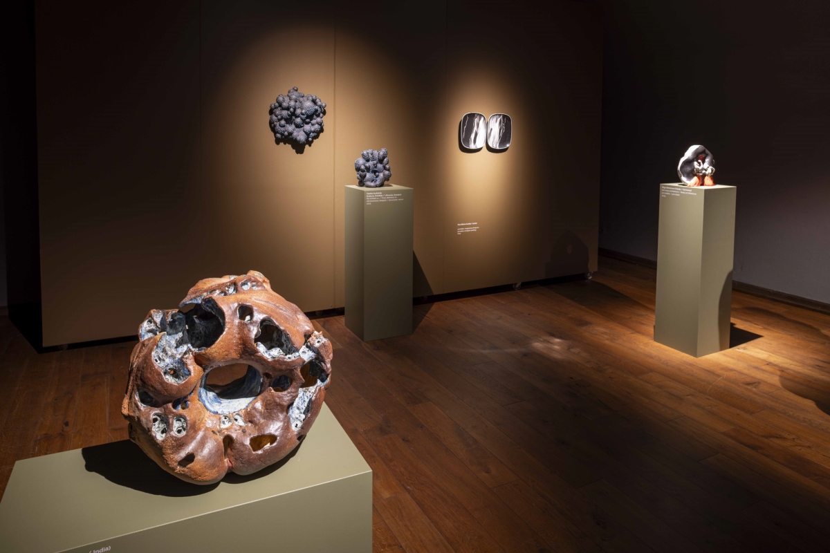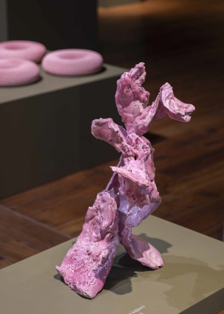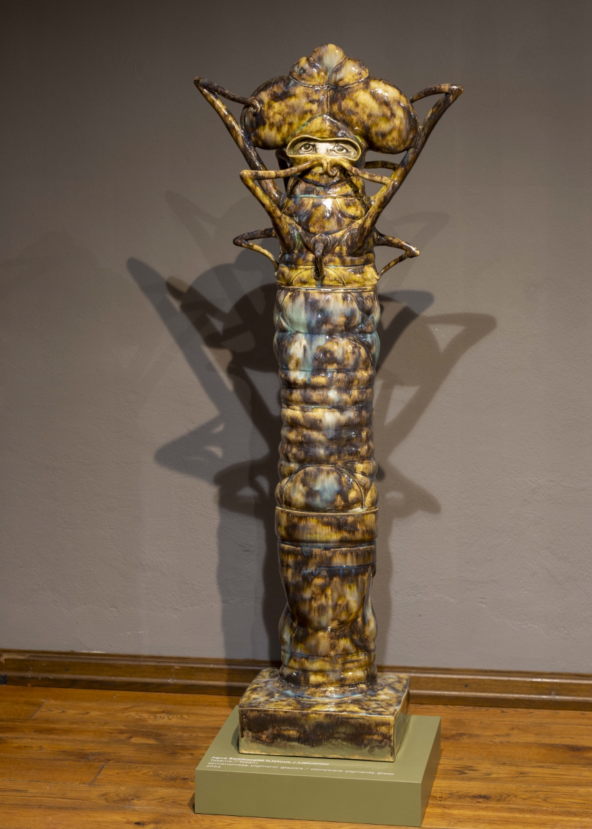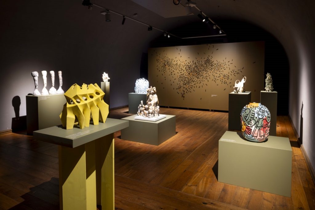 Part of the exhibition features works combined with non-ceramic materials, or use techniques that diverge from those typical of the medium. For example, another honourable mention recipient, Guglielmo Maggini, presents a bright pink creature (something between a living being and an organic natural form) that blurs the line between life and death. Through the combination of natural (clay) and synthetic (resin) materials, the artist explores themes of historical and personal memory. Like Kowalewska and Maggini, several artists address themes of growth and transformation through strange, slightly unsettling creatures, as seen in Agnė Šemberaitė’s Totem, Michał Żesławski’s Fused Together, and Kristīne Niedrāja’s The Firstborn. Particularly organic and sensitive forms characterise Eglė Einikytė-Narkevičienė’s Between Different Worlds. Her works are full of drama and powerful emotional intensity. Drawing on Baroque ideas, the artist examines the eternal conflict while juxtaposing it with the search for harmony. Her vibrant colouring and striking plasticity distinguish her from many others and make her work recognisable on the international ceramics scene.