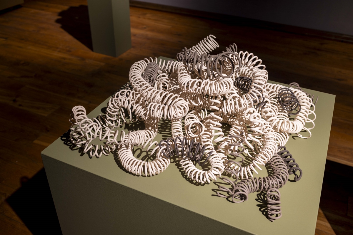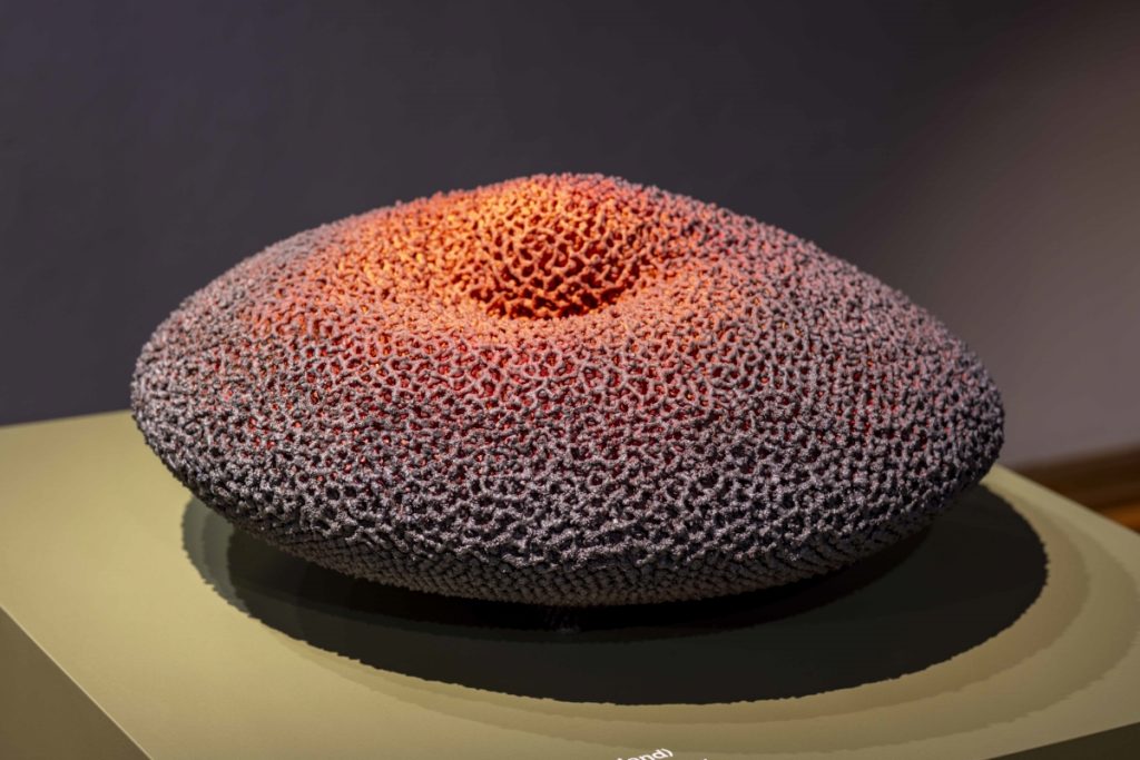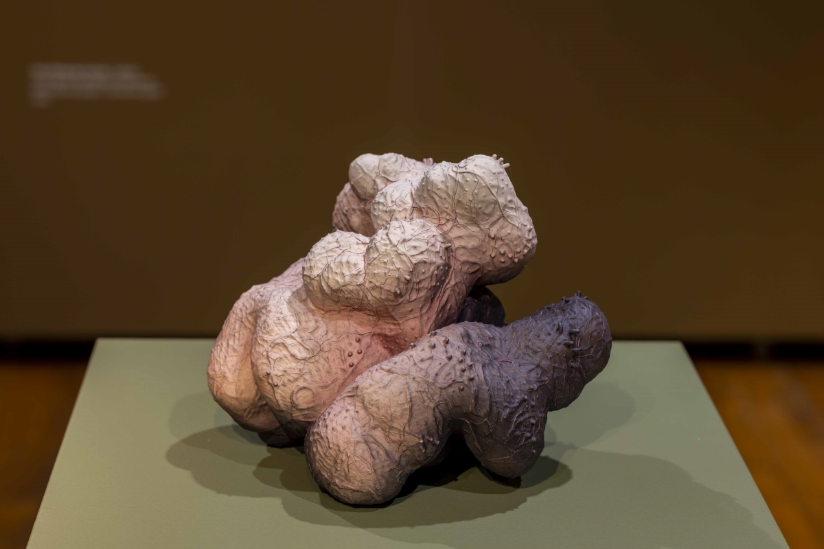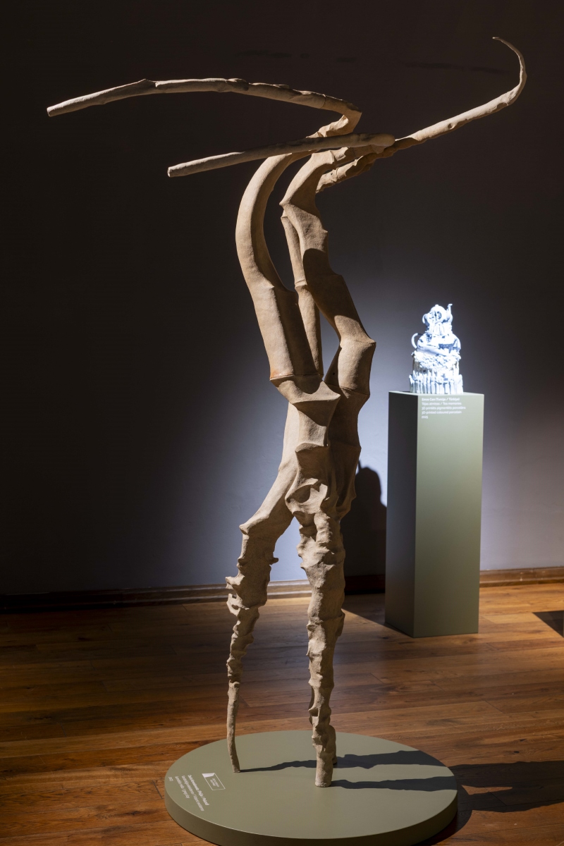 Part of the exhibition features works combined with non-ceramic materials, or use techniques that diverge from those typical of the medium. For example, another honourable mention recipient, Guglielmo Maggini, presents a bright pink creature (something between a living being and an organic natural form) that blurs the line between life and death. Through the combination of natural (clay) and synthetic (resin) materials, the artist explores themes of historical and personal memory. Like Kowalewska and Maggini, several artists address themes of growth and transformation through strange, slightly unsettling creatures, as seen in Agnė Šemberaitė’s Totem, Michał Żesławski’s Fused Together, and Kristīne Niedrāja’s The Firstborn. Particularly organic and sensitive forms characterise Eglė Einikytė-Narkevičienė’s Between Different Worlds. Her works are full of drama and powerful emotional intensity. Drawing on Baroque ideas, the artist examines the eternal conflict while juxtaposing it with the search for harmony. Her vibrant colouring and striking plasticity distinguish her from many others and make her work recognisable on the international ceramics scene.