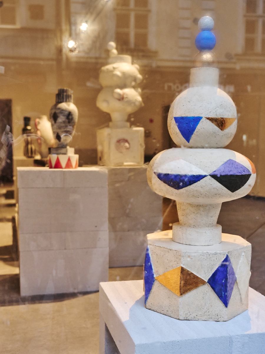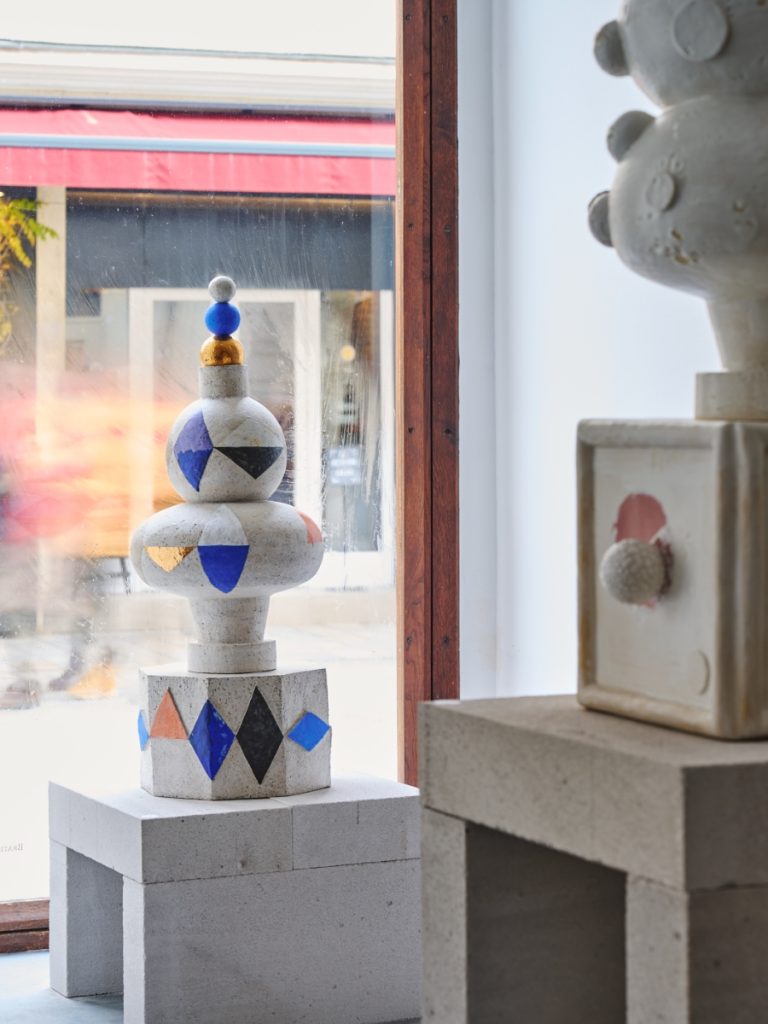 Linda Viková’s identity is rooted in ceramics. Within the rules of her practice we find not only the imperative of craftsmanship, but also the historical permeability and sophistication of the medium. This has been present since her student years—at that time in the form of individualistic “cupcake” objects in her diploma project, which, with disarming distance, hedonistically and feministically referenced strong, inspiring women. Her work has since taken a different trajectory, yet the echo of female energy remains clearly perceptible. In the current exhibition it glimmers in ephemera referencing Eugénia Lugsová, a forgotten Slovak porcelain artist (whose lustre legacy Viková engages with in the work Pierrot), or culminates in a collection of vessels sharing communal clay work with women from the African Kassena tribe. Lightly and with grace, form and narrative seep into ancient mythology (Hemera, Aether), while at other times Viková embarks on a mature and moving journey into the stories of commedia dell’arte. She ambitiously tests the parameters of the ceramic medium through interdisciplinary collaborations (the object Meet Me Halfway, created with painter Patrícia Koyšová).