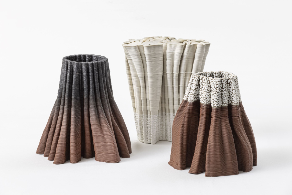 Galerie Lélia Mordoch (Paris) showed a collection of vessel objects by Miguel Chevalier, Arnaud Borde, Michel Paysant, and Jonathan Keep, which were created using 3D-printing. Also, the Peach Corner Gallery (Copenhagen), a forum for showing different approaches to clay and a diversity of ceramic expressions, presented five Scandinavian artists, including Hilda Piazzolla, whose works are searching for a personal touch in digital creation. The most obvious characteristic is the horizontal ribbed structure, which is based on the layered structure of the artifacts. All shapes and structures are a result of mathematical calculations. 3D-printing offers design possibilities that are hard to realize through manual processes: undercuts, hollow chambers, grid structures with variable intersections and the finest surface structures.