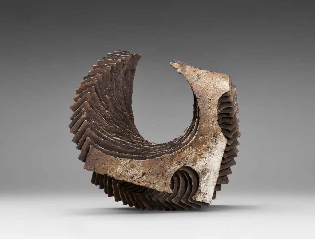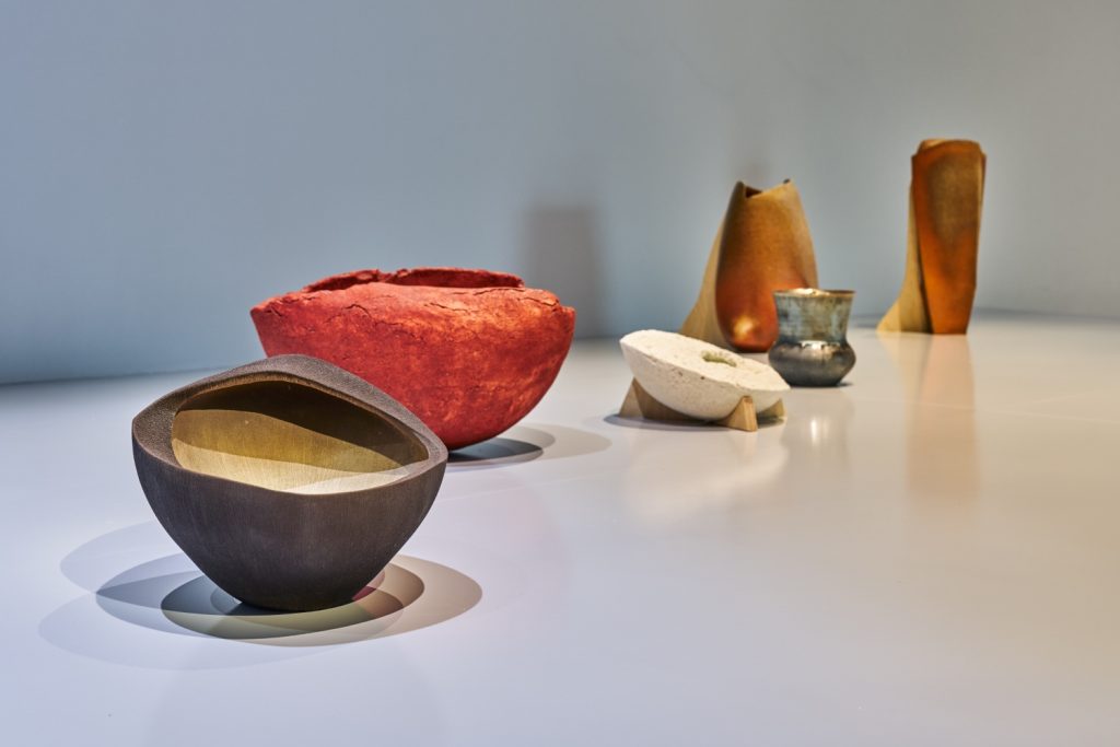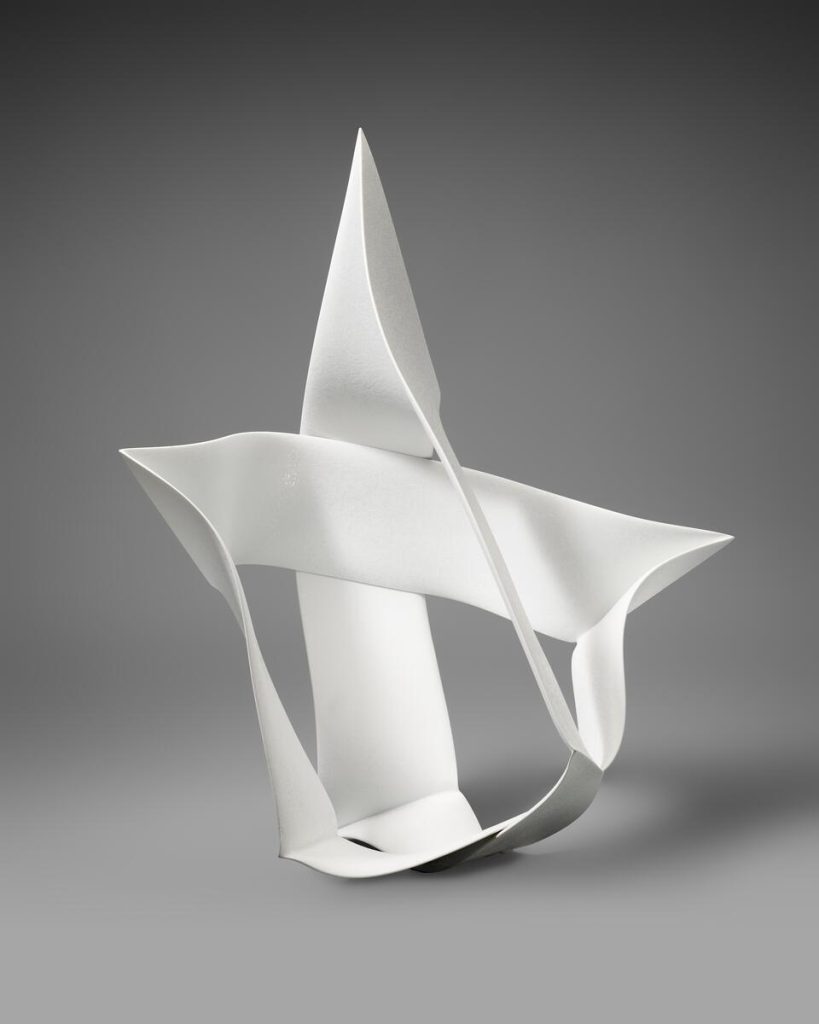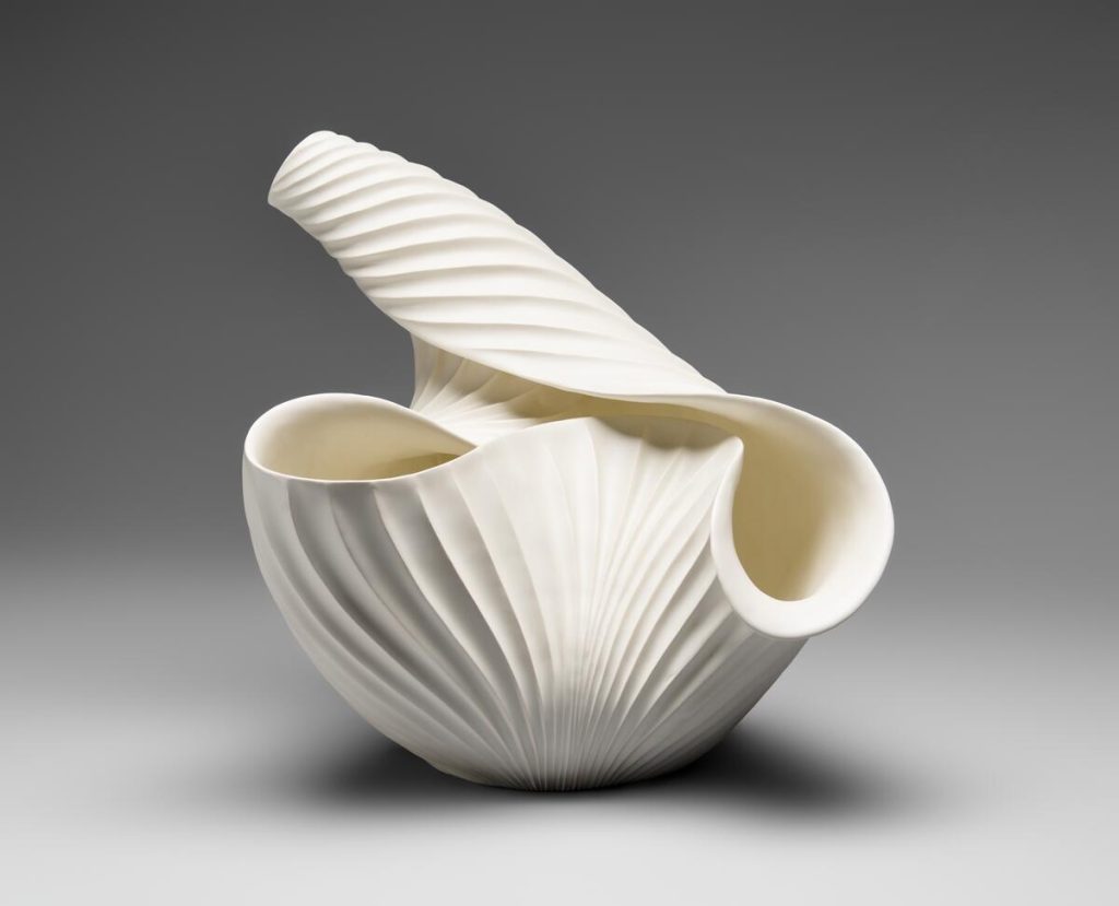 Nagae Shigekazu’s “Forms that Entwine” (2017) is proof of his dexterity as a craftsman, but also his conceptual thinking about porcelain slip-casting. Like Yukiya, Shigekazu works with free standing origami-inspired shapes where the viewer is left wondering how the artist manipulated the paper-thin clay into shapes that seemingly betray gravity. In the end, the ribbon-like form surprises and almost transforms itself into an abstract figure. The poetry in this work lives in the lightness of the porcelain and the arching shapes that display both strength and fragility.