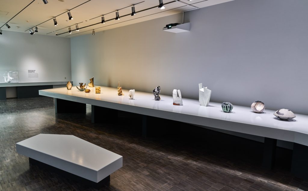 The change in perspective is key to understanding the exhibition, New Japanese Clay, at the Asian Art Museum in San Francisco (through February 2026). The long, dark exhibition room employs a waist-high platform that stretches the length of the space, spotlighting nearly thirty vessels from contemporary Japanese ceramicists. The viewer walks the length of the tall winding countertop, taking in each vessel in a manner that makes each artwork in this show feel monumental yet accessible.