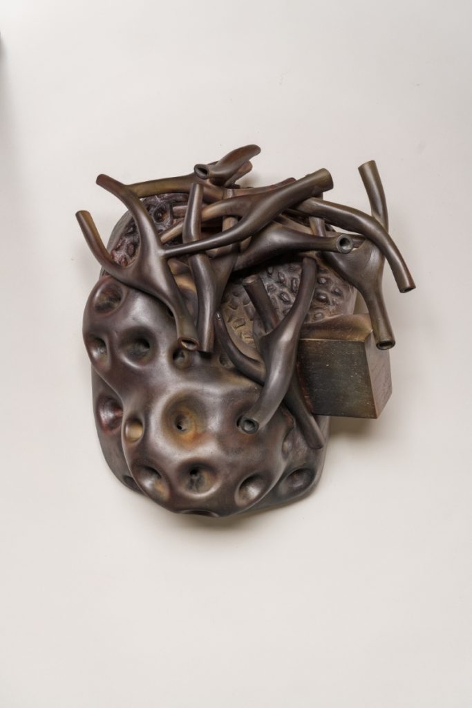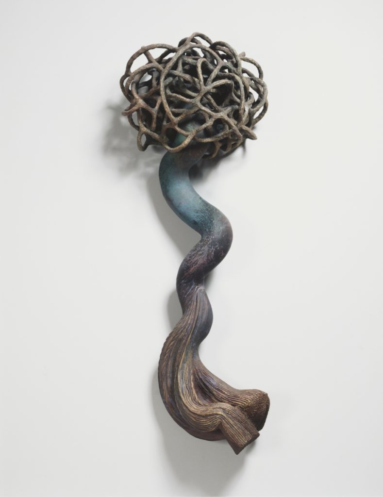 Seen together, these exhibitions suggest that Carpenter’s prominence is through a deep investment in community. It’s the first time that Carpenter’s work has been shown with the included contemporaries. At the Frances M. Maguire Art Museum, Re-Union underscores this ethos by situating Carpenter’s work in dialogue with that of her contemporaries. Re-Union, a possible nod to foundational American ideals, means to unite again. Carpenter curates a show as part of her three-solo shows in the Philadelphia area: a selfless and uplifting move by the artist. Flanked on either side of the visitor’s center are two galleries with mustard yellow accent walls. The centerpiece of the exhibition, symmetrically on the far walls, and on pedestals below, are wall-hung and works on pedestals from Carpenter’s Stem series. Her Stem series takes on an organic, bodily, vessel-like form. Even their names have health connotations like Adjust Pressure to Normal (2005), Blood Ties (2005), Potion (2004), and Carrier (2005). Conflating the ecological with the medical emphasizes the relational importance of what happens beneath the ground and the body. “[The Spiral] was inspired by the natural growth patterns of many plants, which ascend vertically in a spiral fashion…,” she says. “My aim, therefore, was to translate this natural gesture into the sculptures, giving them muscularity and grace.” Their surface ranges from a graphite-sheen, crust, rust-like texture, and green-oxidized-looking patina that mimic environmental exposure.