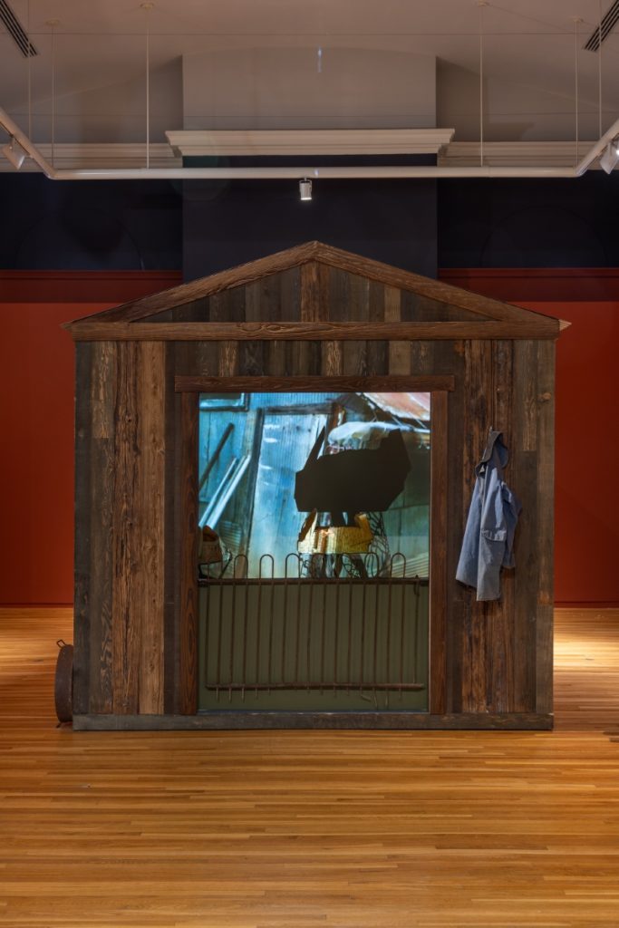 Other sculptural works throughout the exhibition further articulate these themes of memory and inheritance through vernacular everyday objects. Mother pins Series are sleek bodies that evoke the feminine form. The artist remembers her mother using these and thus represents her through recreating the clothespin form. Ramshackle fence (2008-12) is a makeshift structure that Carpenter encountered during her travels in the South. As the magnum opus of the show, it restates her focus on everyday objects: motherpins, bottles, a shotgun house, a shirt hanging up, and a bucket. This is an emblem of the resourcefulness of African Americans. The Table Farm Bowls series delineates specific names like the farm portraits, but arranges them in a way as if to offer or provide those folks a seat at the table, and repetition of her motifs of eggs, houses, and kidney beans, but also adds a cow’s head.