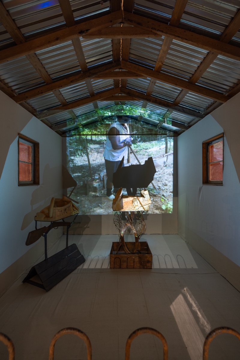 Other sculptural works throughout the exhibition further articulate these themes of memory and inheritance through vernacular everyday objects. Mother pins Series are sleek bodies that evoke the feminine form. The artist remembers her mother using these and thus represents her through recreating the clothespin form. Ramshackle fence (2008-12) is a makeshift structure that Carpenter encountered during her travels in the South. As the magnum opus of the show, it restates her focus on everyday objects: motherpins, bottles, a shotgun house, a shirt hanging up, and a bucket. This is an emblem of the resourcefulness of African Americans. The Table Farm Bowls series delineates specific names like the farm portraits, but arranges them in a way as if to offer or provide those folks a seat at the table, and repetition of her motifs of eggs, houses, and kidney beans, but also adds a cow’s head.