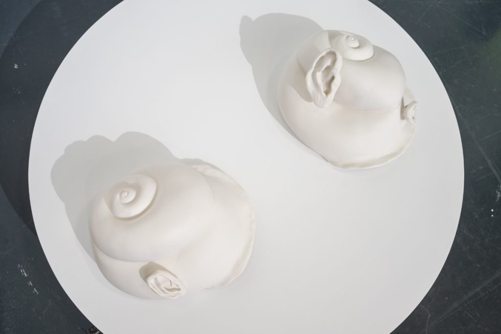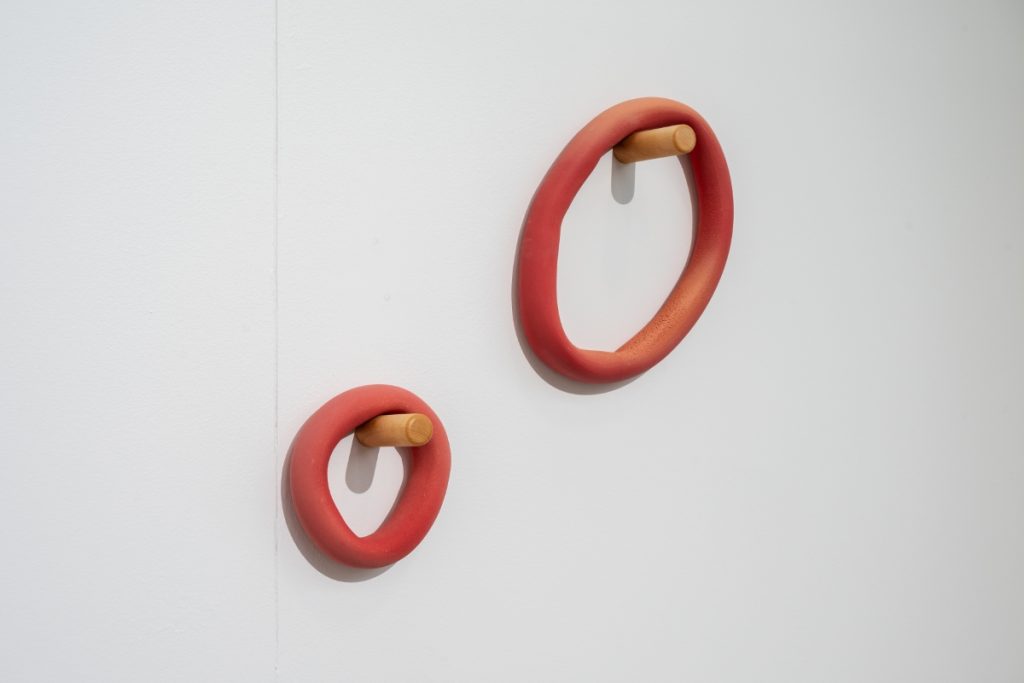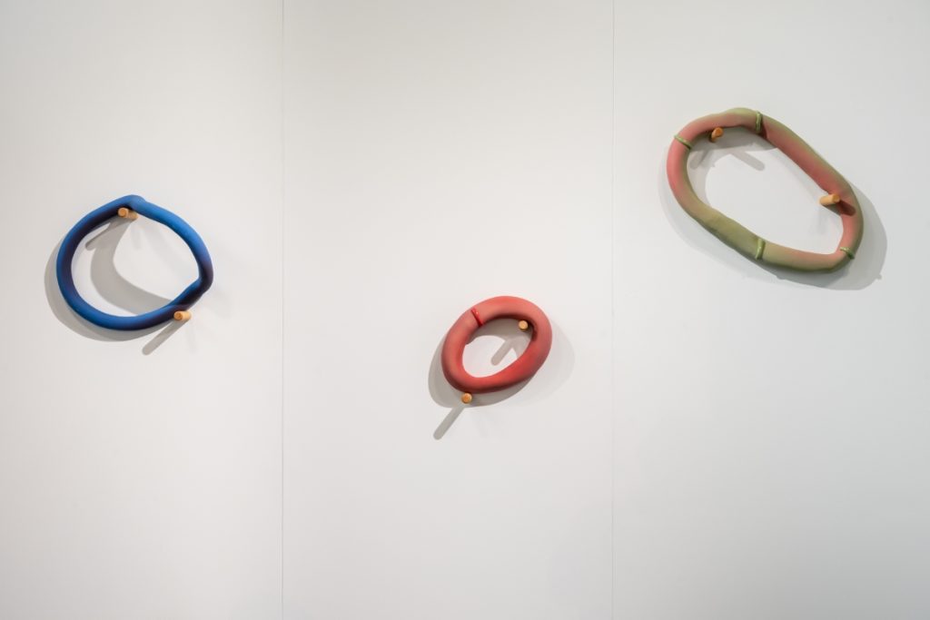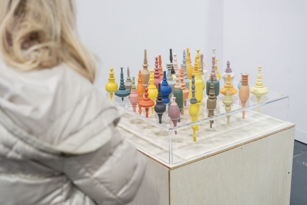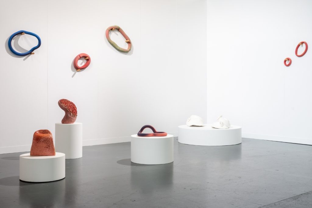 Another contemporary voice exploring the body and material engagement was presented by the gallery Osnova, which recently opened a location in Valencia and showcased works by Arina Antonova (1980) alongside Maya Hottarek (1990). Hottarek’s practice examines the body in relation to society, economy, and the environment, resisting binary divisions between nature and artifice, the organic and inorganic, the human and beyond. Her porcelain sculptures Introverted Extrovert (2024) and Extroverted Introvert (2024) explore the body as a portable container, shifting between forms reminiscent of snail shells and human ears, and reflecting modes of existence within a world in constant motion. It was Antonova’s Call for Action project, however, that drew special attention at the fair. Trained in archaeology and art history at the University of Hamburg and the University of Humanities and Social Sciences in St. Petersburg, and later specializing in illustration and animation at the University of Applied Sciences in Hamburg, Antonova brings a multidisciplinary perspective to her work. The artist’s approach is directly performative. Antonova transforms ceramic objects into interactive instruments inspired by wearable forms such as bracelets. The pieces are designed to be activated through movement: visitors are invited to try them on, shift with them, or resist them, creating a performative dialogue in which gesture, motion, and spatial awareness are inseparable from the object itself. Drawing on personal and historical references – from her mother’s plastic bracelets in the 1990s to memories of the late Soviet era – Antonova negotiates the tension between constraint and freedom, strength and vulnerability.