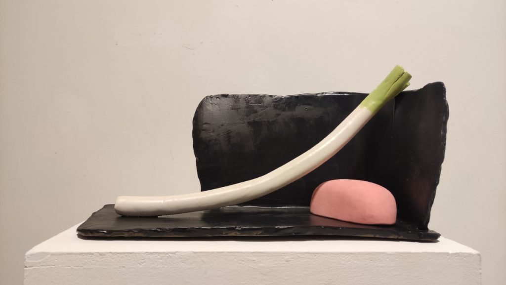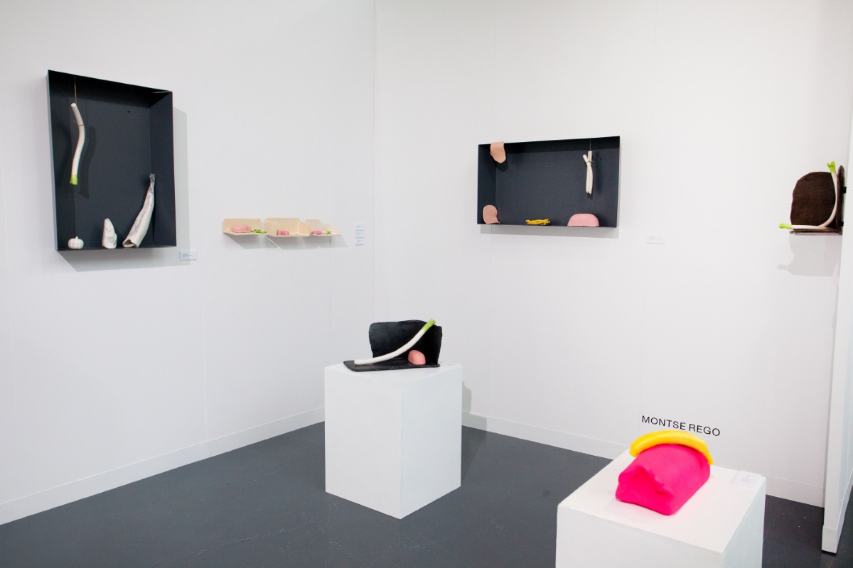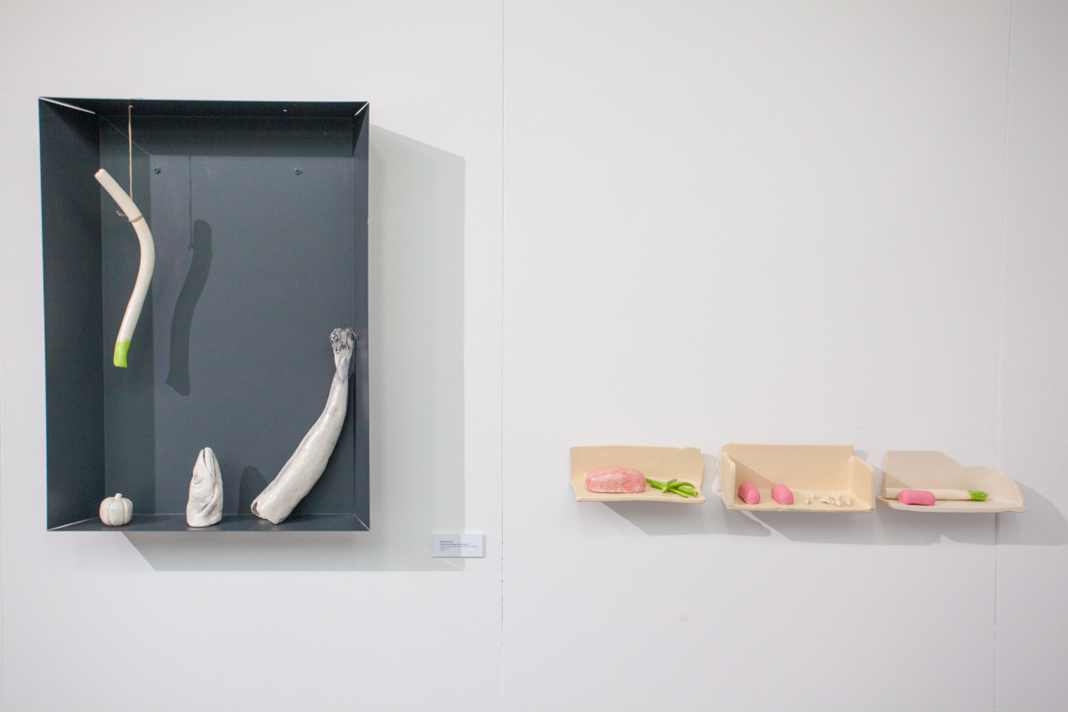 Notably, many of the artists presented by Spanish galleries at the fair work across multiple disciplines, with ceramics often forming just one aspect of their practice. Montse Rego (*1969), showcased by gallery METRO, exemplifies this interdisciplinary approach. Her work moves across installation, ceramics, photography, video, design, and jewelry, unfolding between the everyday, femininity, and the dreamlike to shape a distinctive personal visual language. In her Architectures for Still Life, Rego engages directly with the Spanish still-life tradition, drawing inspiration from the 17th-century painter Juan Sánchez Cotán, a master of the early Spanish bodegón. Cotán’s iconic compositions – still lifes of fruits, vegetables, and game arranged in austere stone niches, often with suspended objects – established a model of spatial clarity and contemplative rigor. Rego reinterprets these formal and conceptual principles, creating theatrical structures where natural foods coexist with ultra-processed products such as mortadella. The works operate on multiple levels simultaneously: the historical dialogue with Spanish art, references to pop culture icons like the “Pink Panther,” and a critique of contemporary consumer society all coexist, unfolding gradually as viewers explore the pieces. The juxtaposition of the wholesome and the banal, nutrition and spectacle, permanence and ephemerality, introduces humor and playfulness into the composition, while the underlying formal rigor remains central.