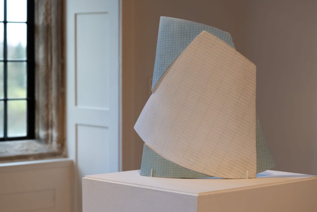 - (fig 1) White Drawing Room Collection | Chevron 1 & 4, 2025, Hand built ceramic with inscribed line and vitreous slip. Image credit: Robin Zahler