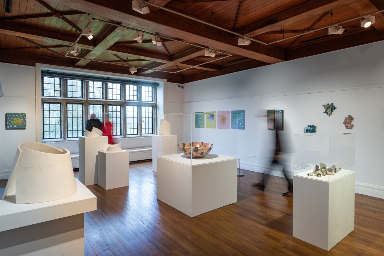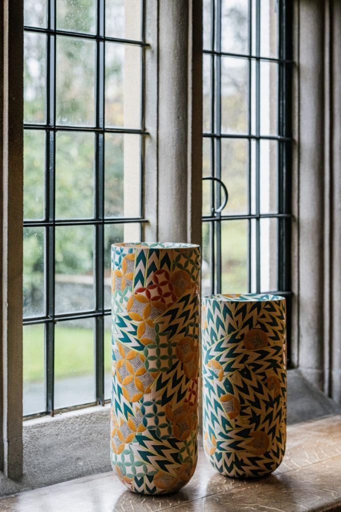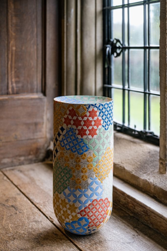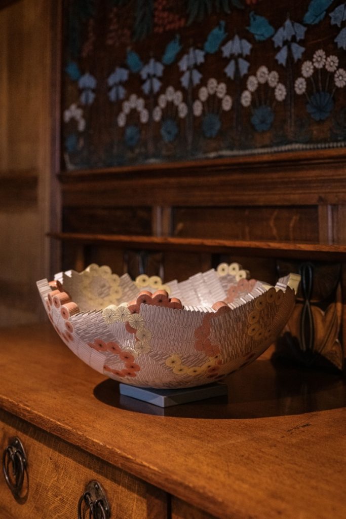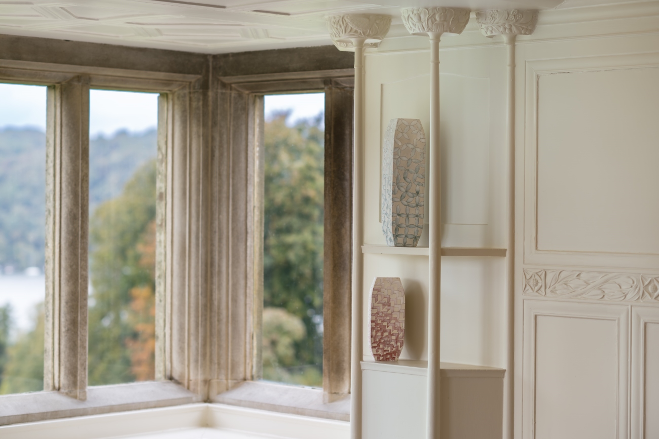 Frances Priest: Motif | Line | Colour brings together over 60 works of ceramics, drawings and artworks from across her making career, into the intimate and historic setting of Blackwell, allowing for a range of exchanges between the viewer and Priest’s work that is beyond a typical gallery exhibition experience. We do not encounter her work in isolation set within a minimalist white cube, but through encounters integrated into the rich interior spaces of this Arts and Crafts home. It is as if her artworks are part of the fabric of the building, or artifacts of past custodians, allowing for direct correlations between her practice and the legacy of ornamentation she celebrates. Through their placement in this Arts and Crafts tableau, we see the artist’s eye directing these encounters. Some could be easily overlooked but bring such joy upon their discovery, such as her work Shift Intersect I placed in the window well of the house’s porch. Its form echoes the movement of the stained glass flowers and birds in the panel behind, and its subtle colour nods to the slate floor you stand upon. Others directly draw our attention to decorative motifs present in both the interior and artwork, as seen in the positioning of Gathering Bowl – Collage medium situated below the printed hessian wall covering with their echoing daisy motifs in the dining room. In turn, the Cumbrian landscape beyond the windows beneath which seven of her Patterns of Flora vases sit, illuminate and create sympathetic shadowing to the botany she has stunningly illustrated upon their surfaces. Whereas her new series of works created for the White Drawing Room and named in honour of this space, nestled within the decorative integrated shelving by Baillie Scott, feel as if they are part of the original decorative gesso scheme in their delicate tracery of shared motifs of leaves and chevrons and powdery surface treatment. Elsewhere, the gallery display does not follow a specific timeline or key events but creates moments of discussion between the past and present, gallery series and public commissions.