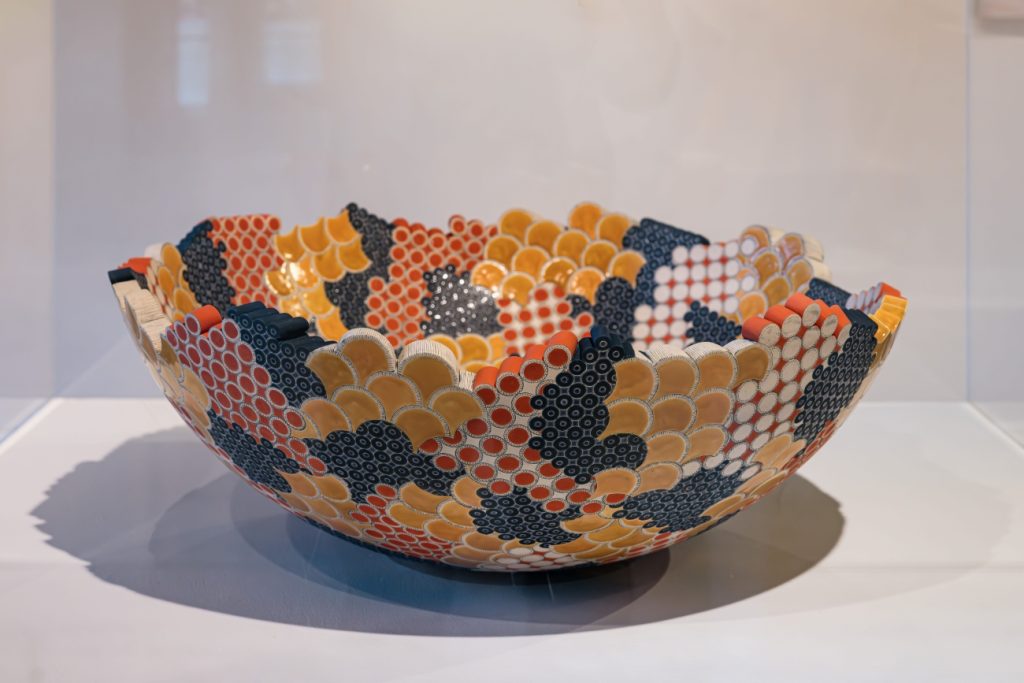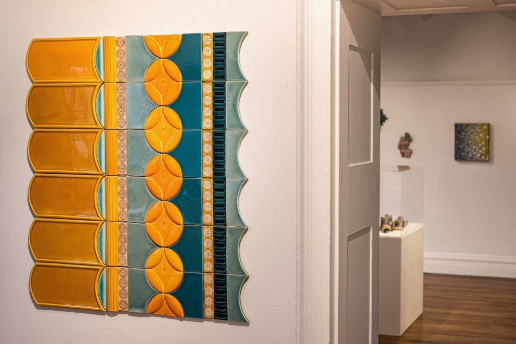 Interaction and emotional response to decoration have come to be an important part of Priest’s practice, not only in how she engages and interprets the decorative, but also how she encourages others to do so through her works. Often collaborating with other makers and organisations, Priest has often gone beyond the vessel form to achieve this in the public sphere. The award winning Tiled Corridor – a section of which is reproduced in the gallery space – that was commissioned by the Royal Edinburgh Hospital for its new centre specialising in mental health, and created in collaboration with Craven Dunhill Jackfield, one of the last manufacturers in the UK specialising in traditional hand-made decorative ceramic tiles; references the ceramic walls of the local Victorian tenements familiar to many of the residents and staff. This vibrant tactile artwork cultivates an emotional connection, creating a sense of comfort and familiarity to an otherwise austere environment in its unveiling in 2018. Another example showcased in the exhibition is the digital animation Imbrication from 2022 – sat in the far gallery space in Blackwell – which was originally commissioned by New Media Scotland for the Stepping in Screen at Music Hall Aberdeen, as a collaboration between Priest and digital artist Sam Healy. This venture into the digital sees Priest’s illustrative motifs inspired by the neo-classical architecture of the venue, encoded into an algorithm by Healy creating a mesmerising sequence that shifts and dances before your eyes, never repeating the same pattern twice, in what can easily be described as a living wallpaper.