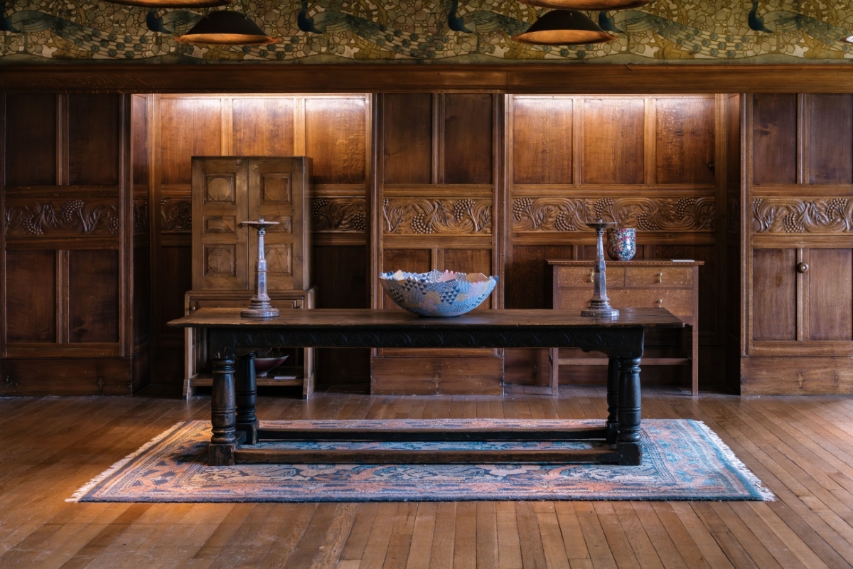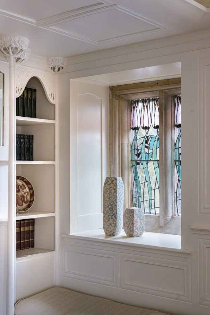 Sat high above the banks of Windermere in the English Lake District, is Blackwell Arts and Crafts House, the former holiday home of the Manchester industrialist Sir Edward Holt (1849–1928). Designed by British architect and artist Mackay Hugh Baillie Scott (1865–1945) at the turn of the last century, the house was conceived during a period of renewed interest in artisan crafts and the handmade that countered growing mechanisation and mass production. Subsequent changes saw the family giving up the house, it being used as a school for evacuee’s during the second world war, and finally as offices. Blackwell, and its richly decorated interior showcasing the best craftsmanship of the Arts and Crafts Movement both locally and from across the UK, was only saved from being a distant memory thanks to the Lakeland Arts Trust, who restored the house to allow it to be opened to the public as a period house and gallery in the early 2000s. Upon encountering Blackwell, you cannot help but be captivated by its beauty. The often watery Cumbrian light traverses through the space illuminating the interior so that your eye travels from the wonderfully carved ornamental wooden panelling to the stained glass windows, and from printed wallcoverings to ornamental plasterwork that reflect and play homage to the surrounding natural environment. The House’s orientation allows every window to frame and capture the distant fells beyond. It is a truly special location in which to celebrate creative endeavours, both historical and contemporary. It therefore seems fitting, that this architectural gem of the British Arts and Crafts Movement has become the setting for the first UK retrospective of Edinburgh-based ceramic artist Frances Priest. For over twenty five years, Priest has been exploring decorative motifs, form, and movement, creating sculptural ceramic artworks that have become widely recognised and celebrated for their reverence to ornament.