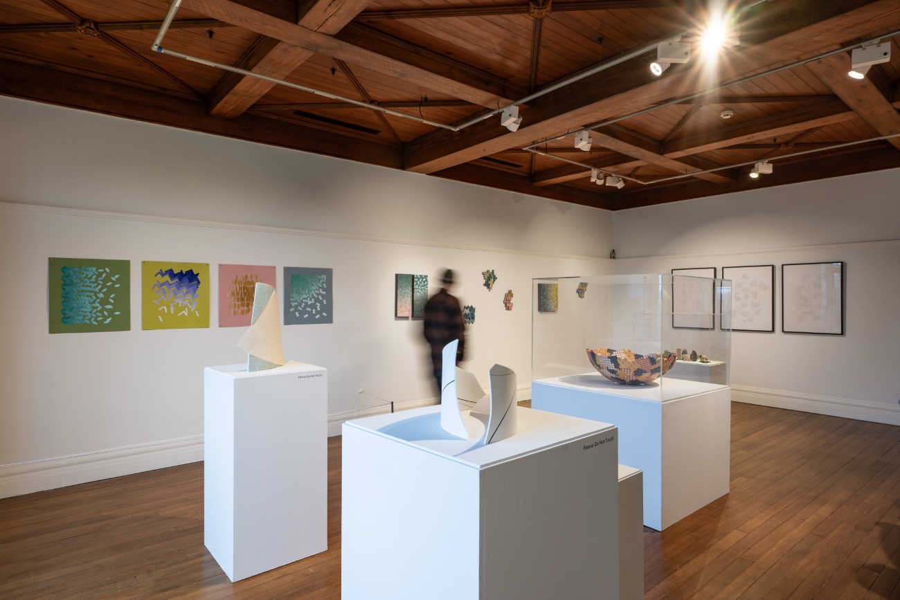 Priest’s earliest works of ceramic art were highly influenced by her training in the late 1990s at Edinburgh College of Art, a period when form and process over surface pattern and decoration still had such power in the teaching of craft. However, even in these earliest works on display, some seen here for the first time in over 20 years thanks to the generosity but also a testament to the relationship Priest has garnered with her private collectors, we can find her intent to explore the possibility and the energy of surface decoration even through the subtlest of applications. For example, what seems at first glance as an energetic flourish of an arm drawing a line between the two interconnecting monumental forms of Broken Ellipse Series I, on closer inspection reveals itself to be a series of overlaid ovoid’s encircling the two forms that complete as you move around the sculpture and shift your perspective. Close by in the upper gallery, where we see the Curator’s collective exploration of Priests oeuvre over the 25 years, there is another early work from 2005 – Shifting Grid, juxtaposed cleverly with a series of drawings from her 2024 series Unfixing. These drawings mark a shift away from the full immersive exploration of ornamentation that was her raison d’être at this stage, to motifs that drifted across surfaces as if blown there by some unseen force or loosened from containment. Collectively in this placement of ceramic and set of gouache drawings by the curator, we see clearly the symbiosis of Priest’s practice. One has led to the other, not just through time – the drawings could easily have led to the ceramic, but in the very act of her interpreting motifs and pattern.