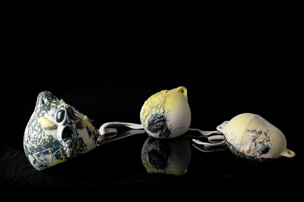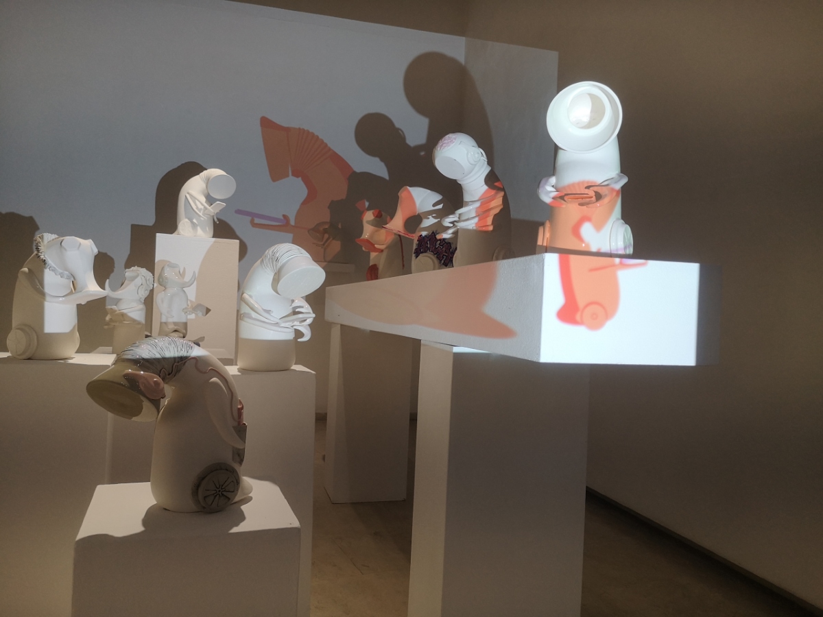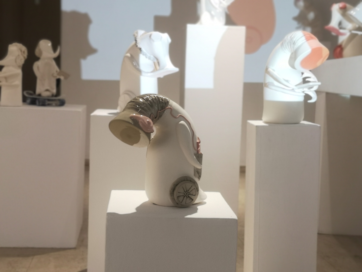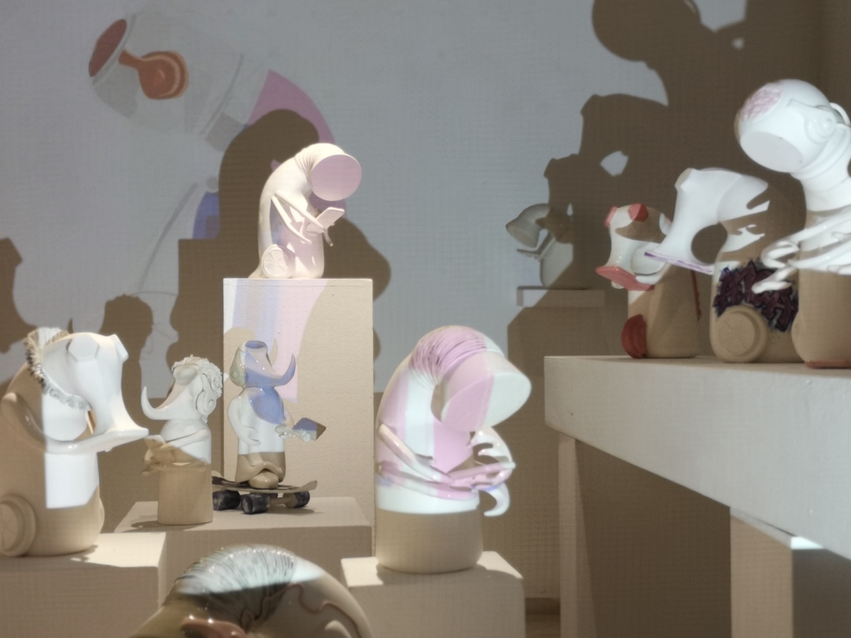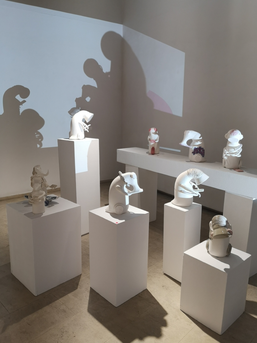 My Neighbour white, 2020, porcelain, pigments, slip casting, ceramic collage 1200ᵒC, 30×24 cm - 3 characters (#Anthropo-ciberneticus), 2019, porcelain, 1200°C, 33 x 26 x 16 cm