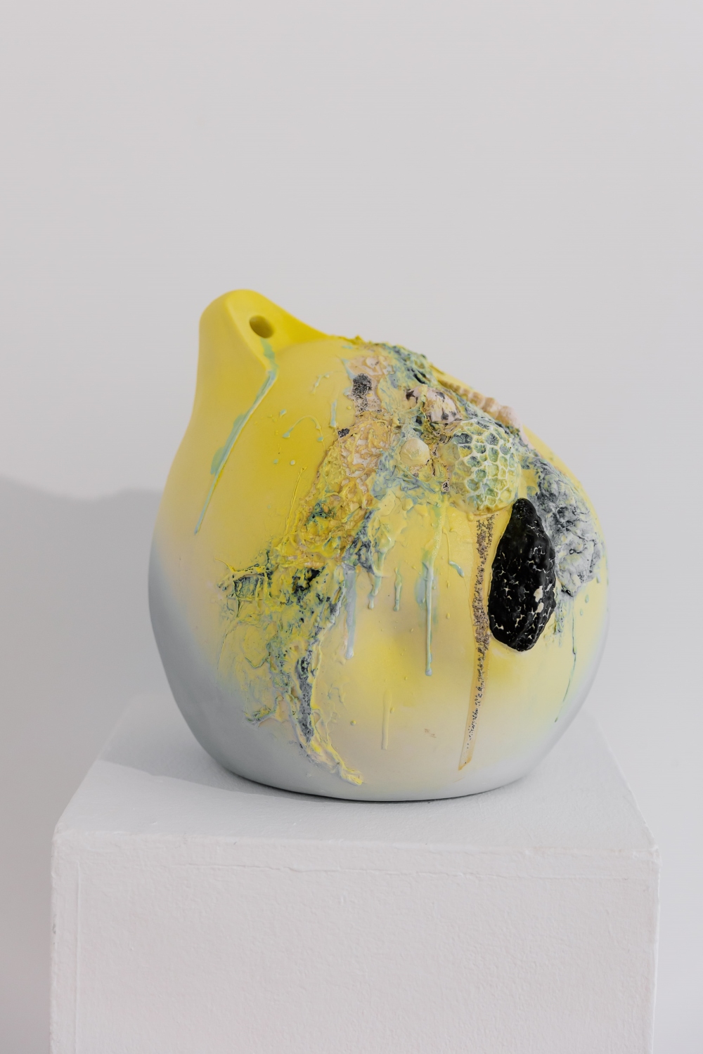 Metamorphosis 3, 2024, colored stoneware, resin, electric firing 1240﮿ᵒC - My Neighbour pink, 2020, stoneware, glazes, luster, hand built, 1200ᵒC, 30×24 cm