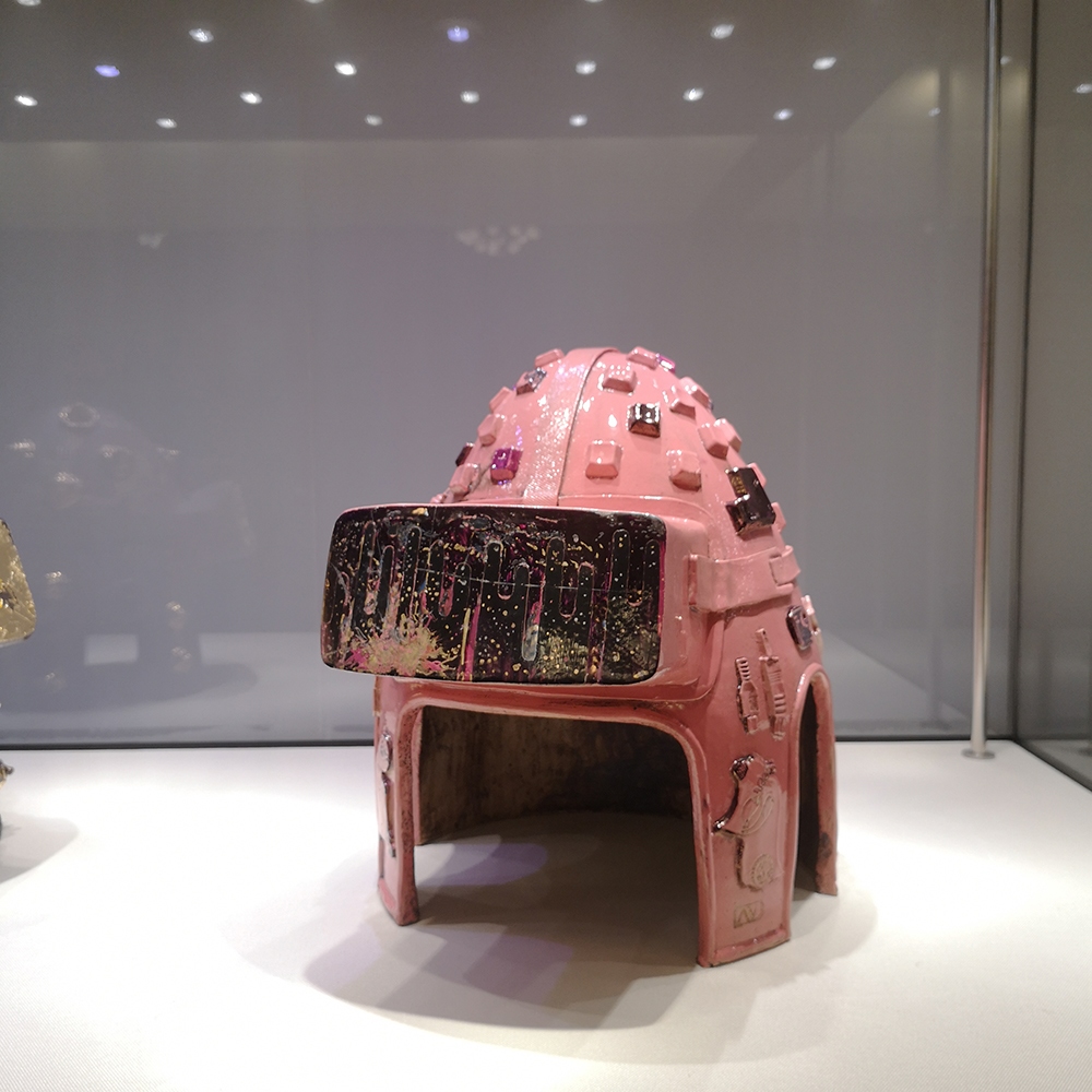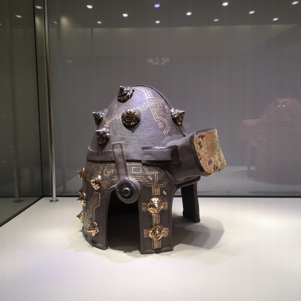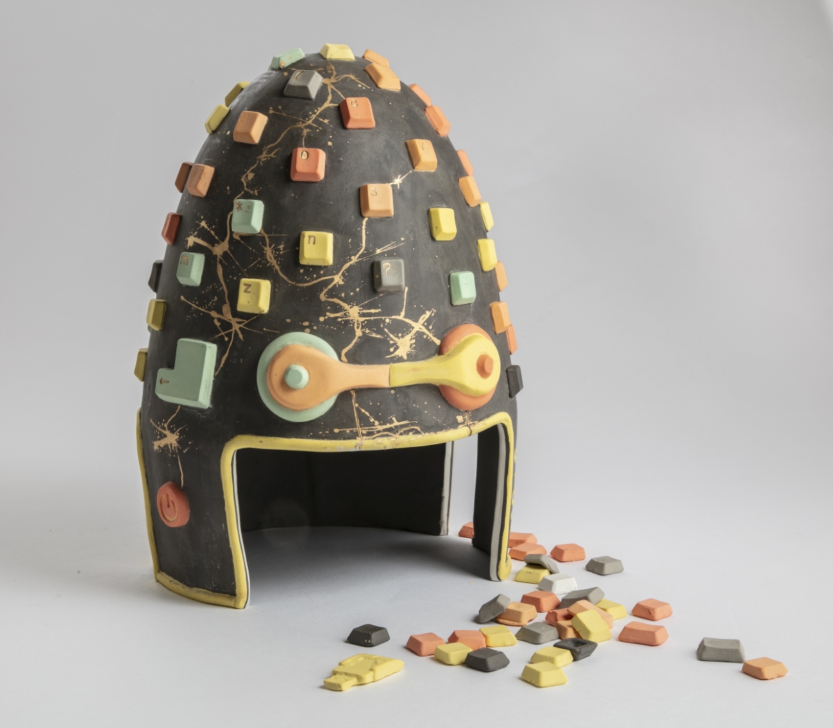My works are narrative, they tell stories. The series of helmets aims to create a bridge between my ancestors, the Geto-Dacians who wore these ceremonial gold or silver helmets and one of my latest themes: our addiction to technology. The helmet worn by the warrior kings symbolized the power conferred on them by the supreme Deity. My helmet suggests that Man is a God in this humanist era, through the infinite power provided by unlimited access to information and technology.