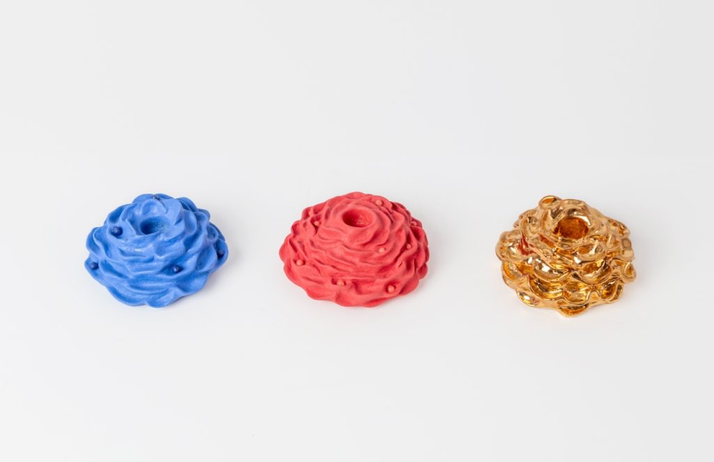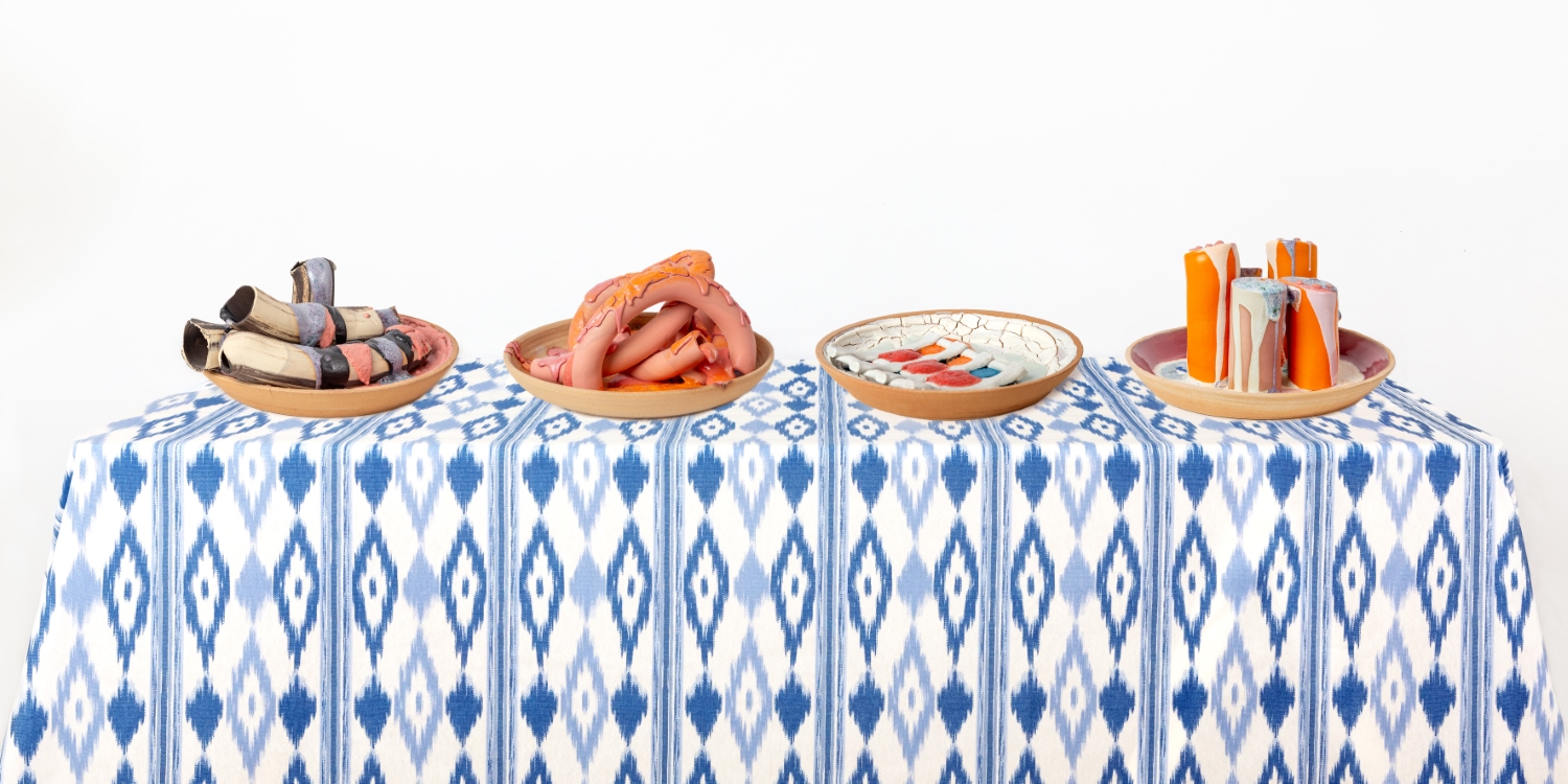 Chloris Roses, 2024, stoneware, pigments, gold luster; each 15 x 15 x 10 cm - Matanza installation view, 2023, Mallorquin ikat pattern fabric, stoneware sculptures; 70 x 75 x 200 cm