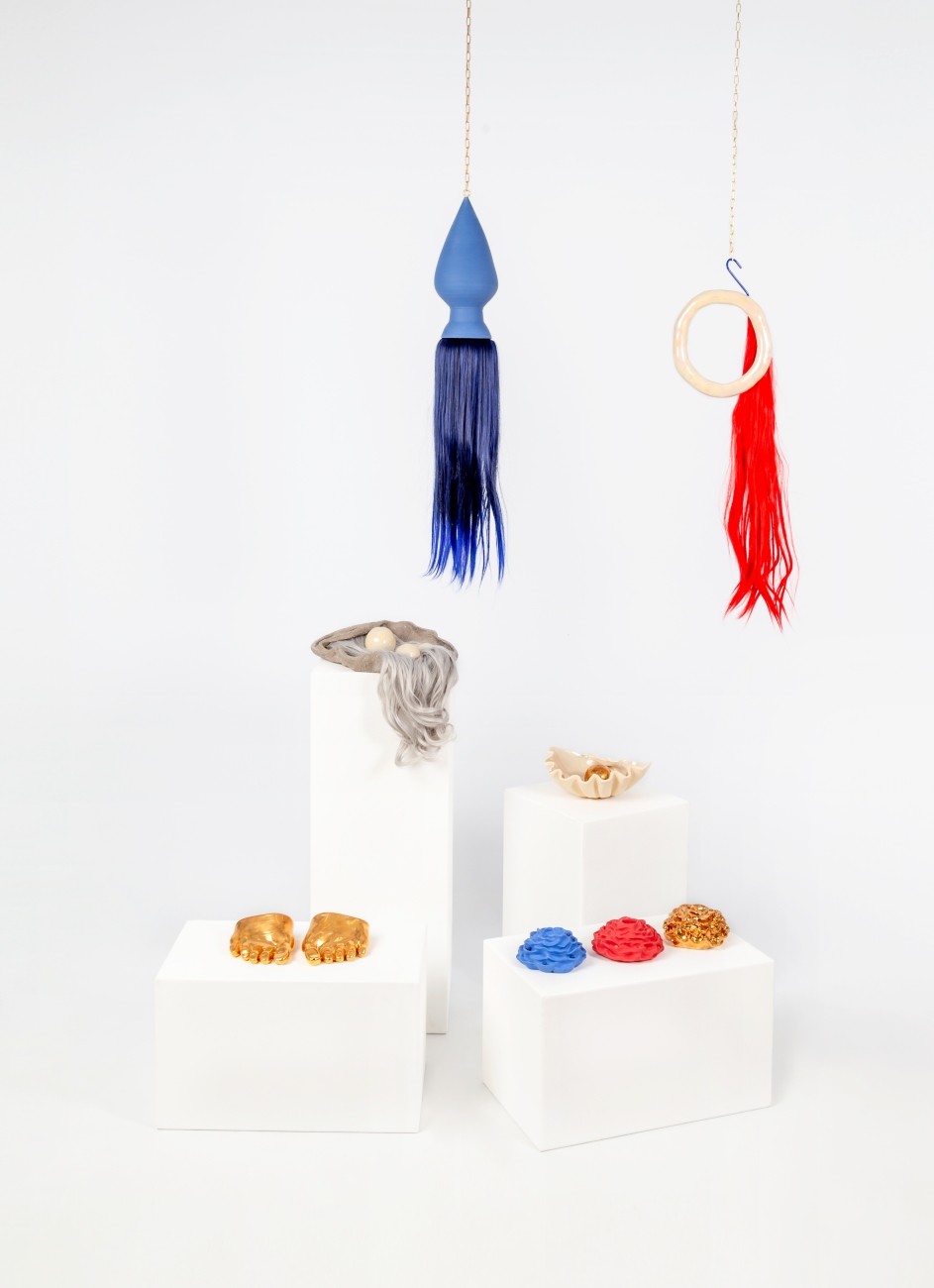 In “Venus Oyster” I deliberately transform Venus’s wavy locks from blonde to grey, questioning conventional notions of beauty. “Venus Feet” stands for the most common fetish for body parts today. “Zephyr Amphora” with long blue hair symbolizing the wind, takes on a provocative form, shaped like a plug, while “Chloris Roses” in gold, red, and blue impart distinct meanings to the rose. Introducing an interactive piece, “Holy Nimbus” I invite viewers to step into the goddess’s feet by trying it on. This ergonomically shaped sculpture fits every head, whether male or female.