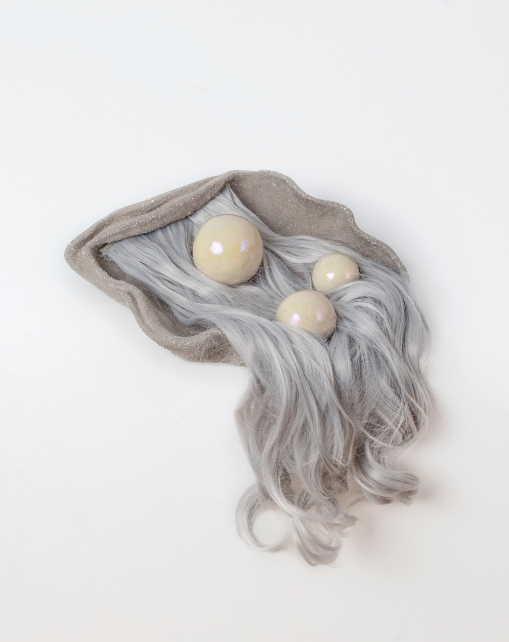 Venus Oyster, 2024, stoneware, mother of pearl luster, synthetic hair; 30 x 25 x 10 cm