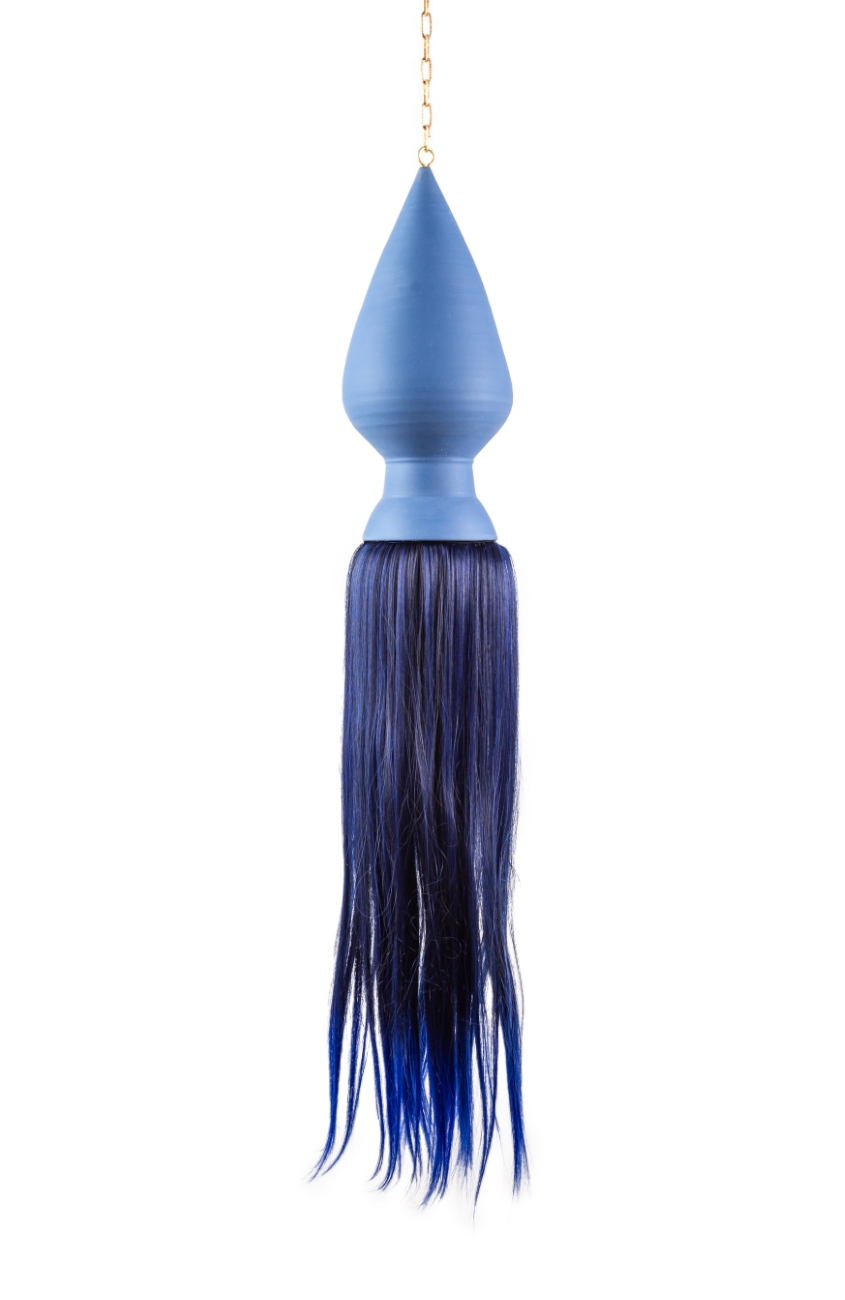 Zephyr Amphora, 2024, porcelain, synthetic hair, metallic chain; 33 x 15 x 15 cm / with hair 80 cm, chain 1,5 m