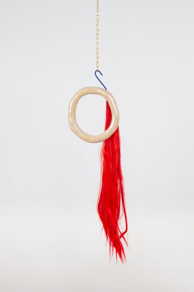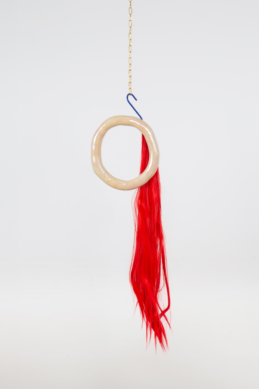 Holy Nimbus, 2024, mother of pearl luster, synthetic hair, metallic chain; 4 x 15 x 20 cm / with hair 40 cm, chain 1,5 m