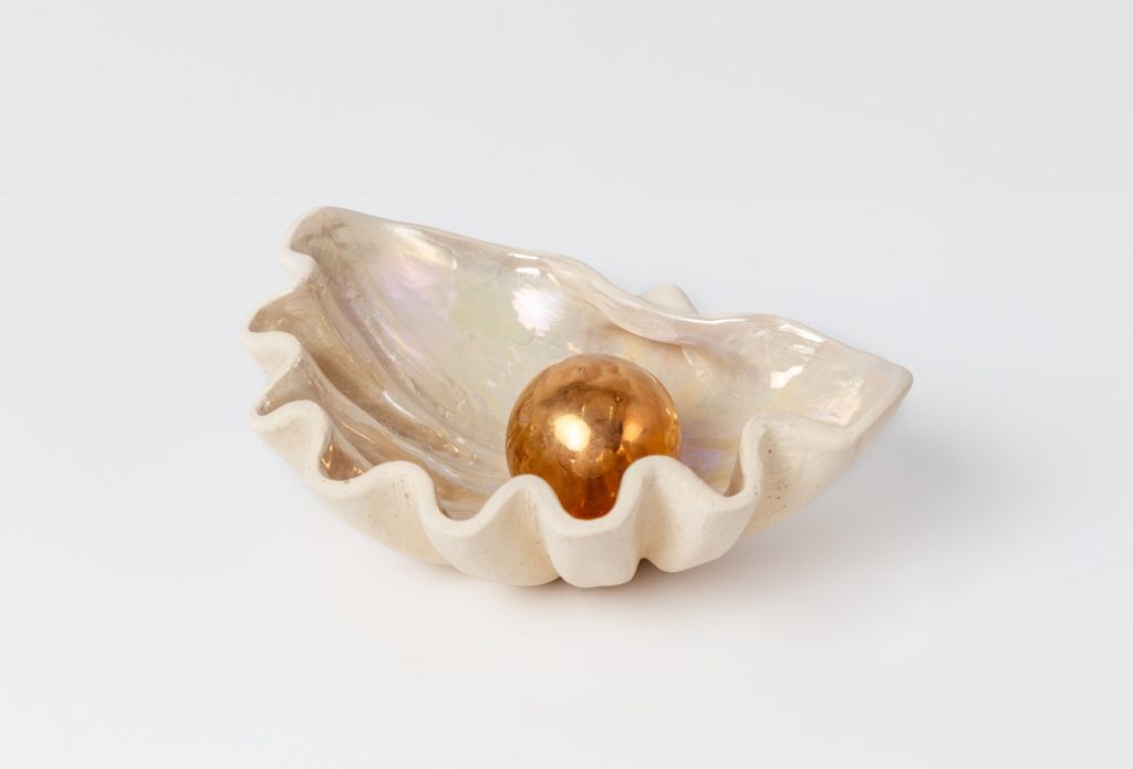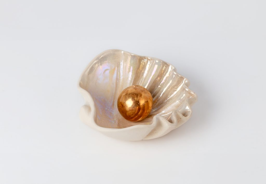The Birth Shell, 2024, stoneware, mother of pearl luster, gold luster; 20 x 25 x 8 cm