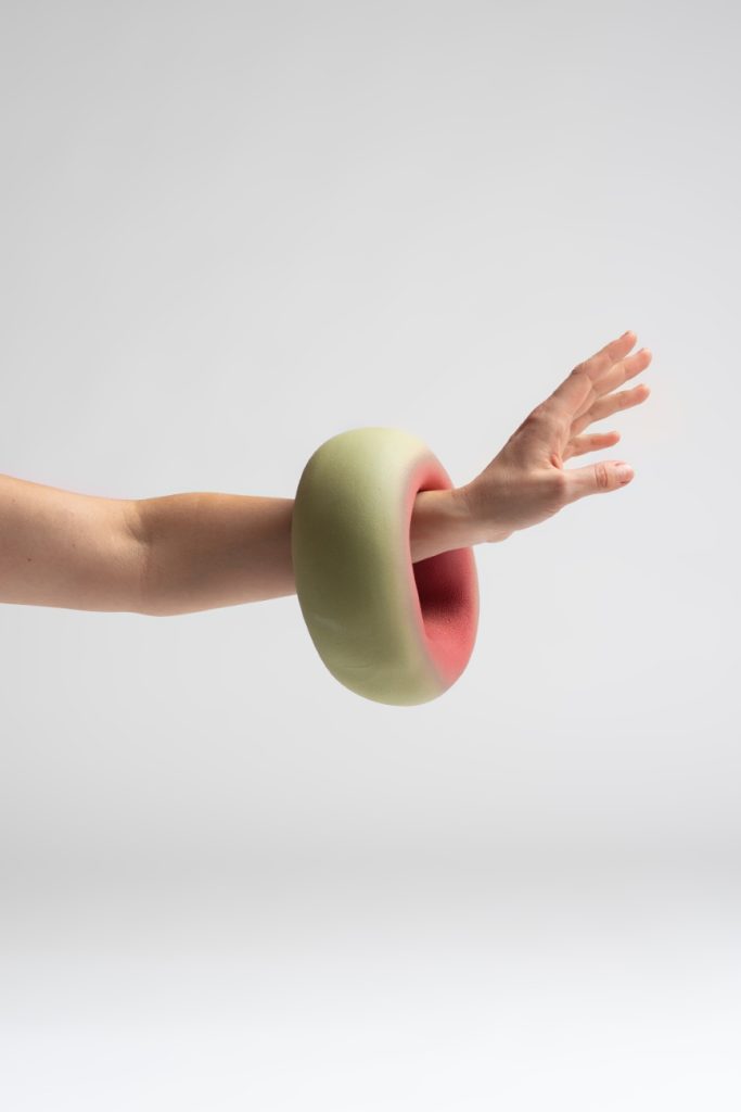 These pieces are inspired by the colorful plastic bracelets I used to find in my mother’s jewelry box — relics of the 90s, that for me, evoke the paradoxical atmosphere of the late Soviet era: a moment when long-held social constraints collided with the emergence of new, seductive freedoms. The sculptures may not fit everyone or feel comfortable — and that’s intentional. They offer the wearer a physical and emotional encounter with boundaries, resistance, and the longing to move beyond them.