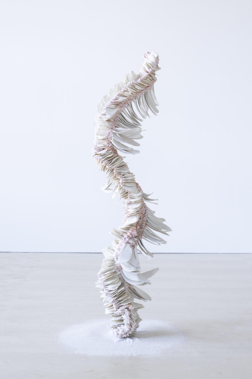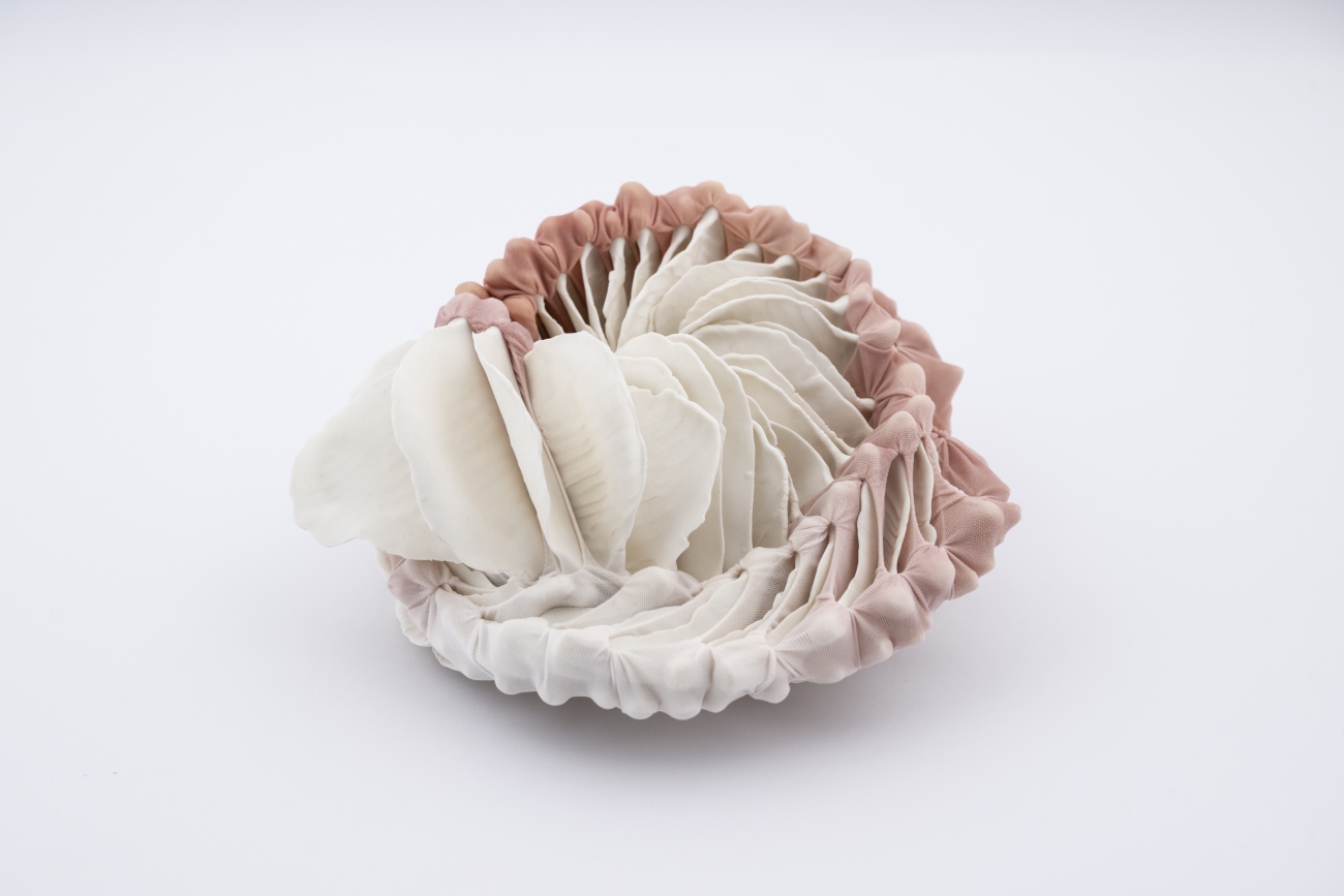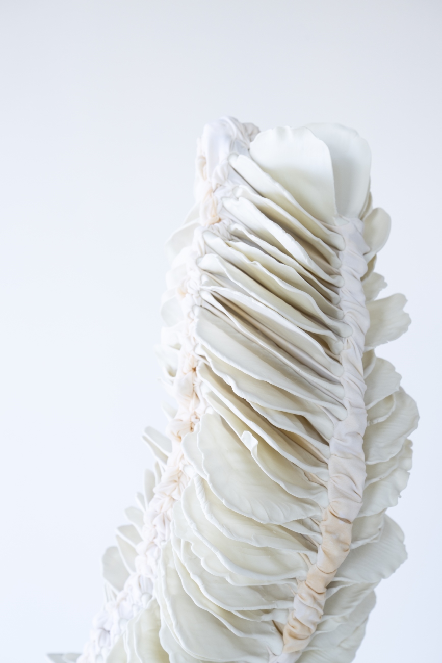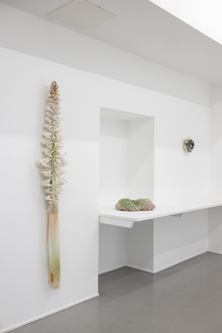 Almost Blooming III, 2025, hand shaped porcelain elements, dyed nylon fabric, tied, 125 x 40 x 35 cm, Photo Thor Brødreskift