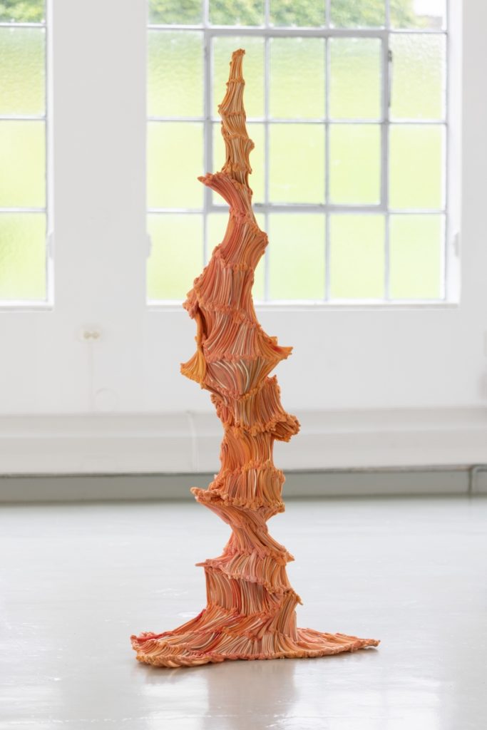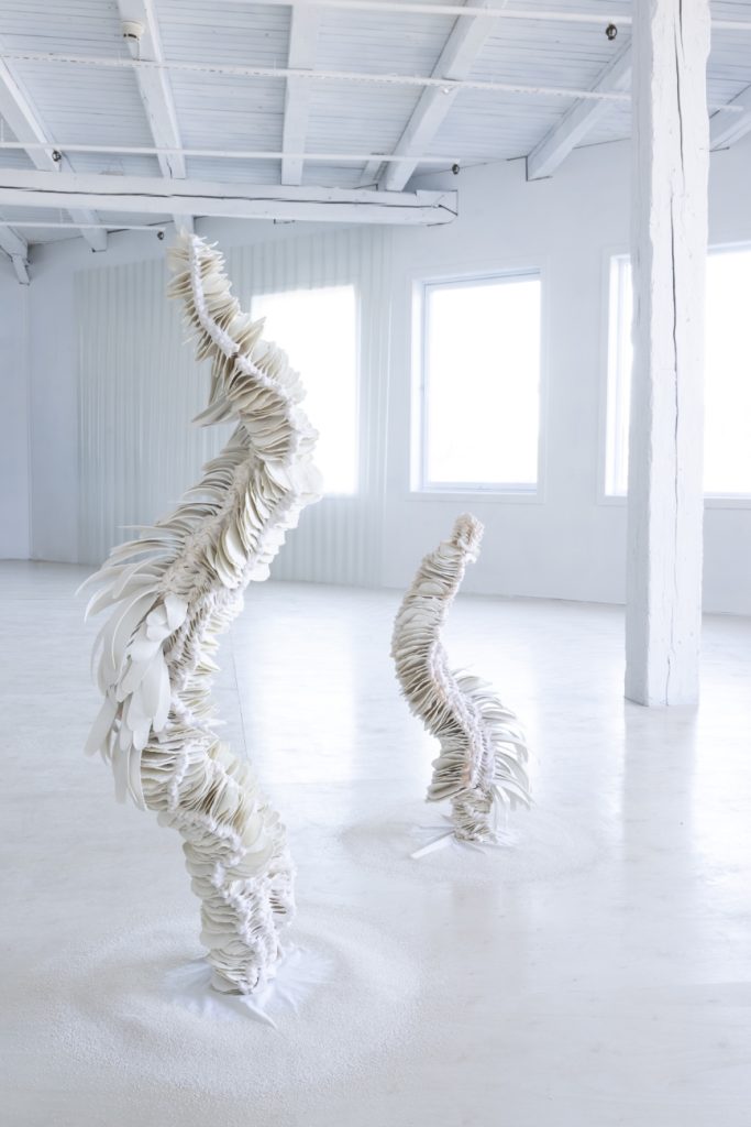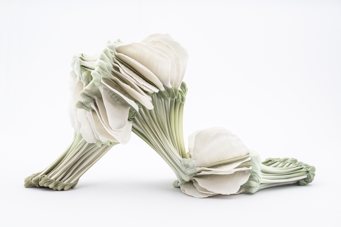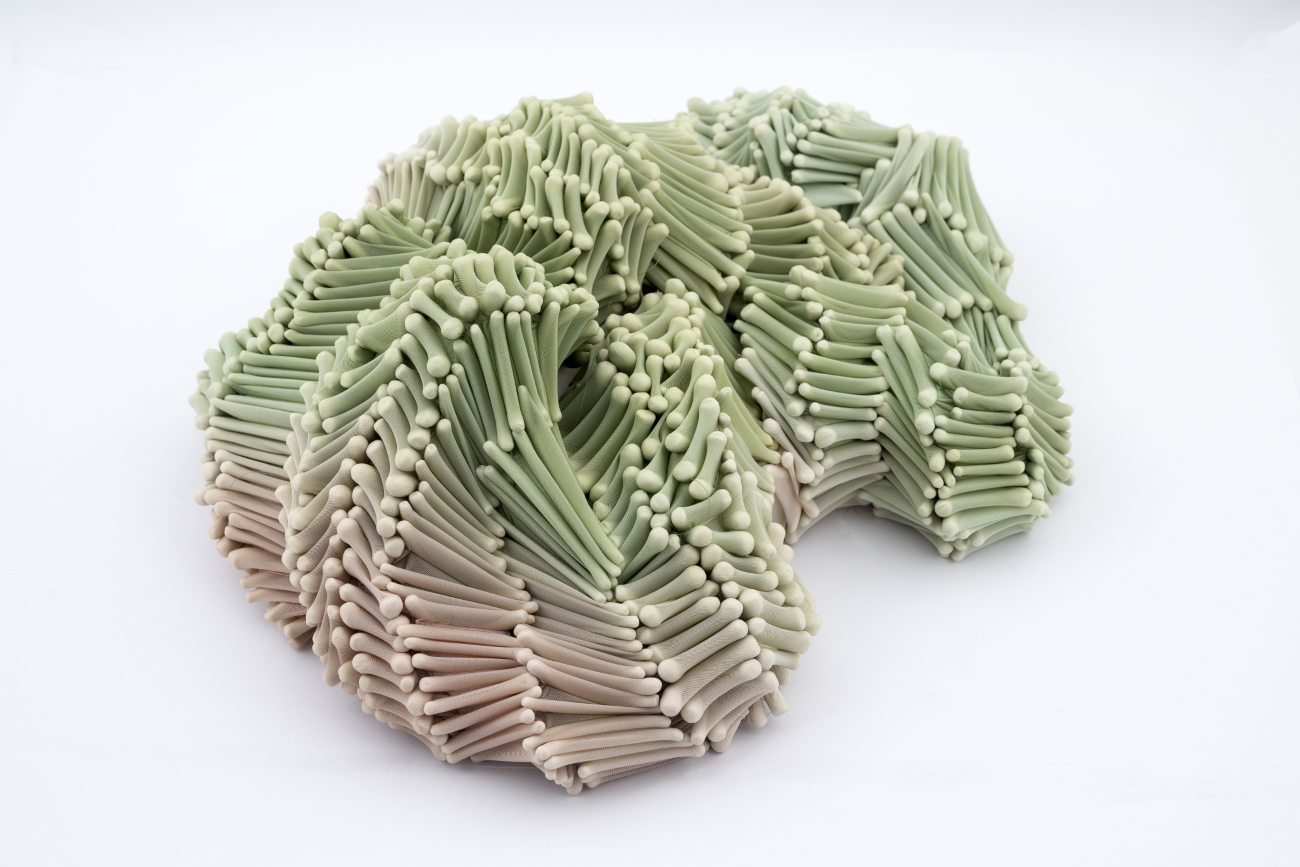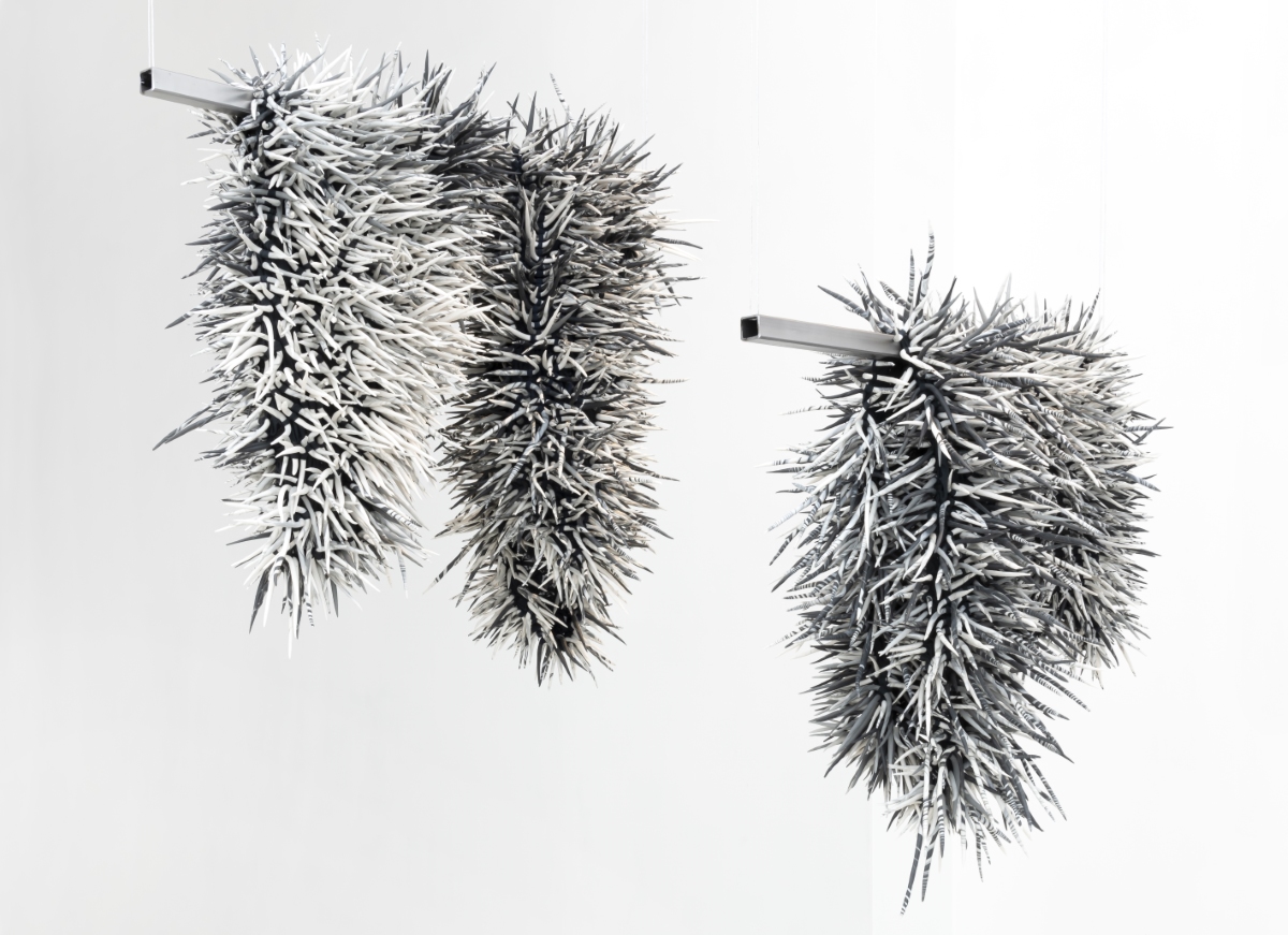 Almost Blooming III, 2025, hand shaped porcelain elements, dyed nylon fabric, tied, 125 x 40 x 35 cm, Photo Thor Brødreskift