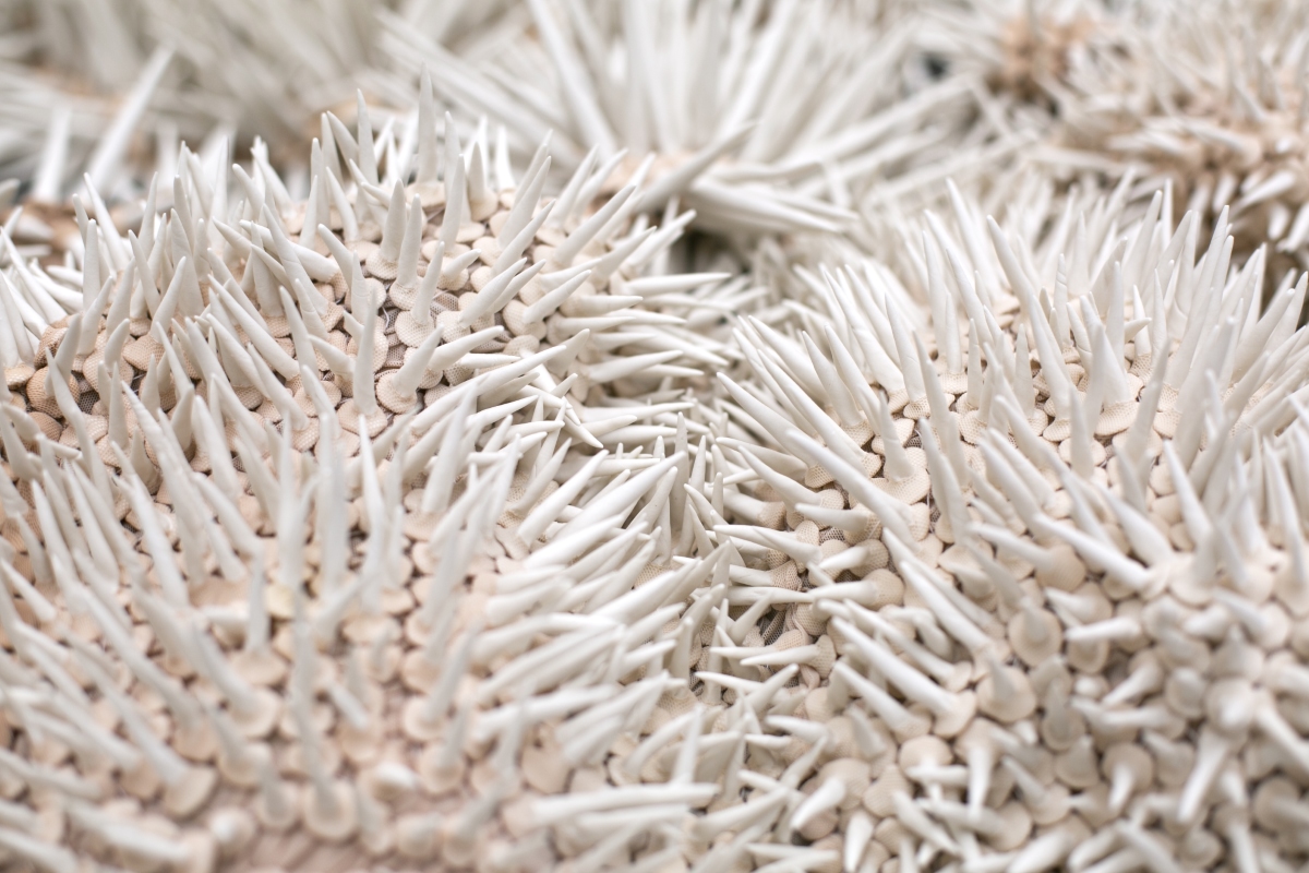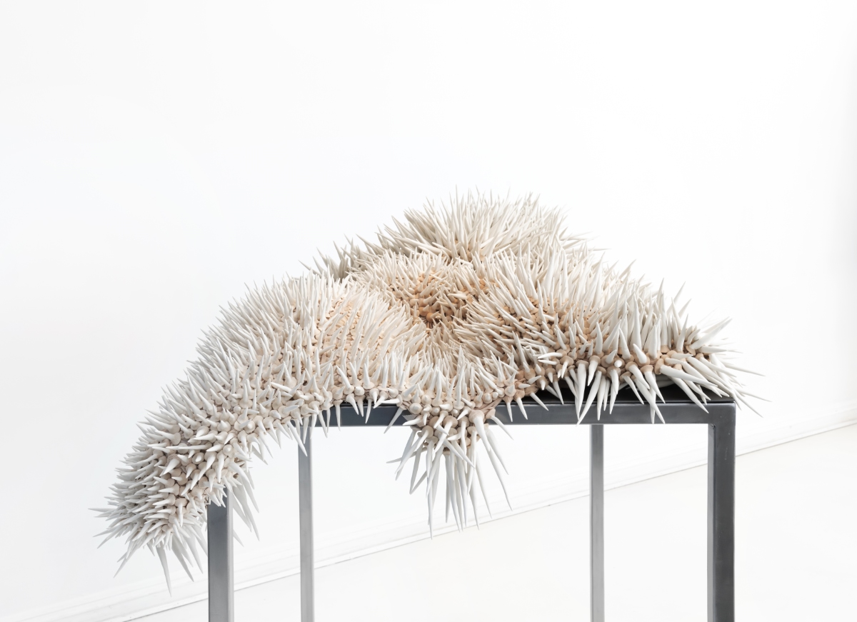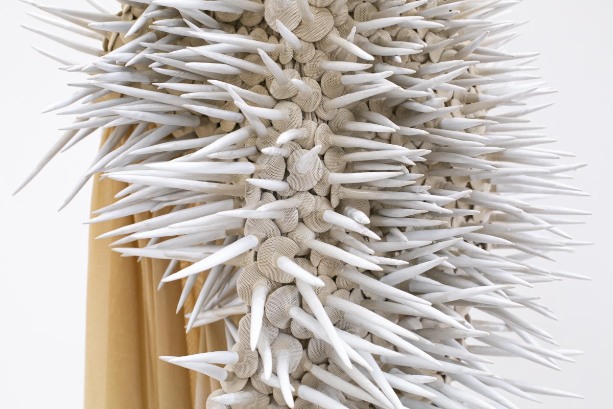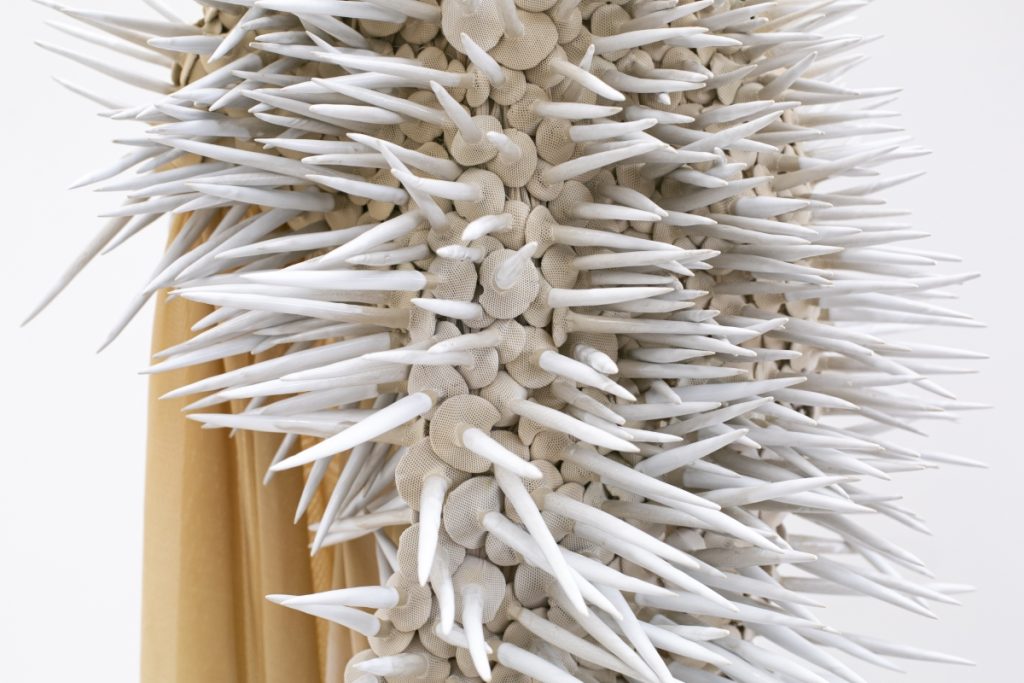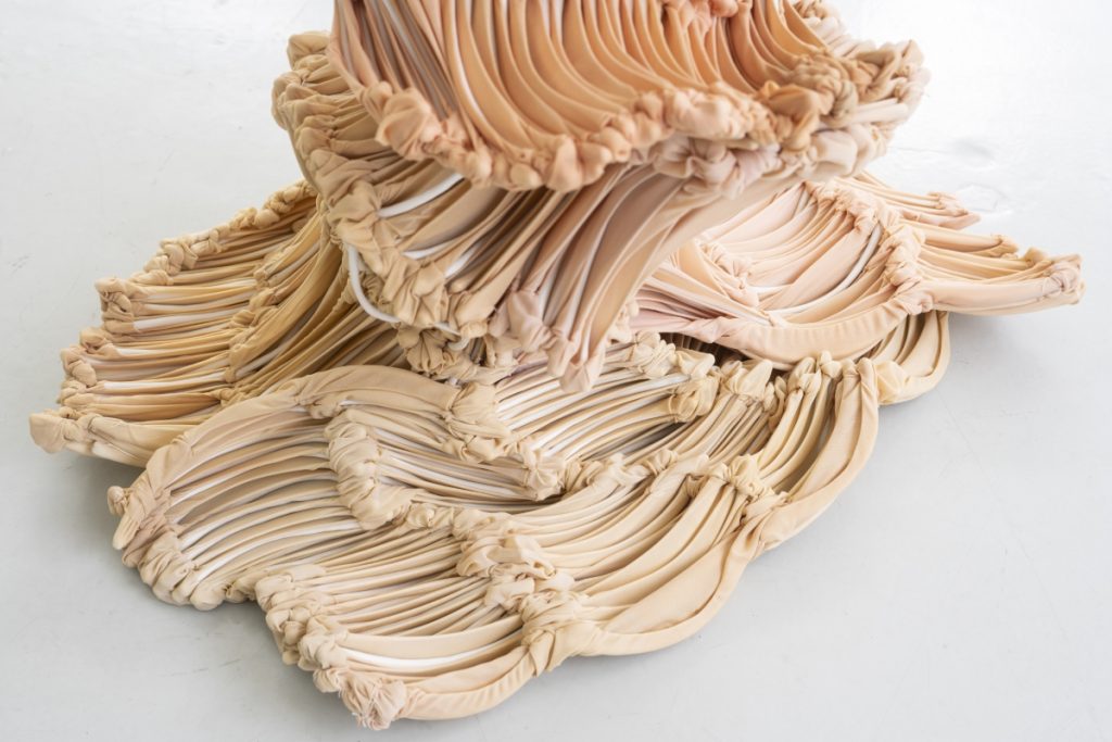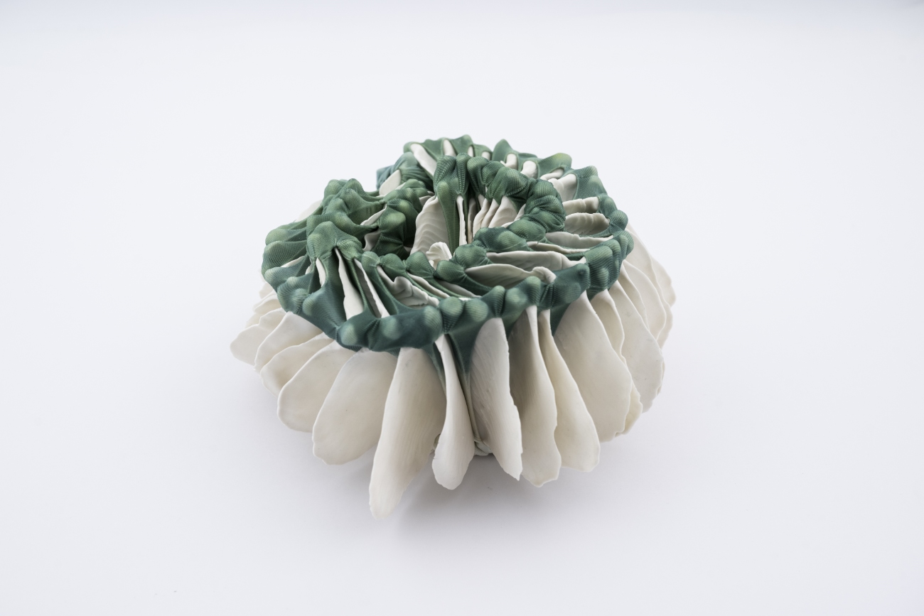 Hybridia, 2020, dyed nylon fabric, handshaped porcelain elements, tied, constructed metal plinth, 50 x 70 x 90 cm, Photo Øystein Thorvaldsen