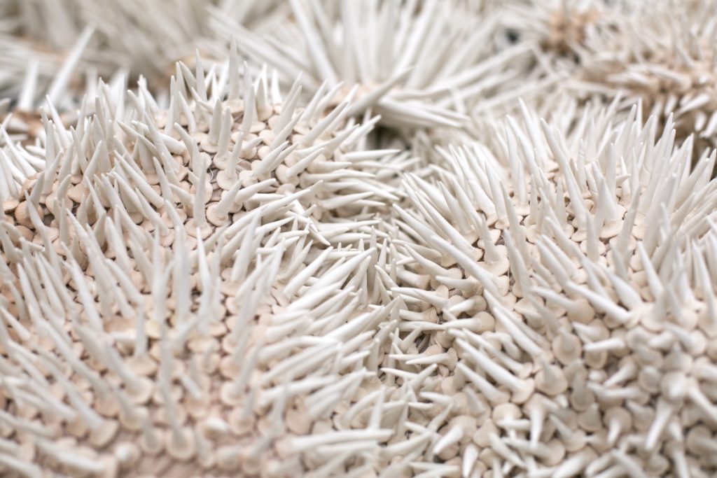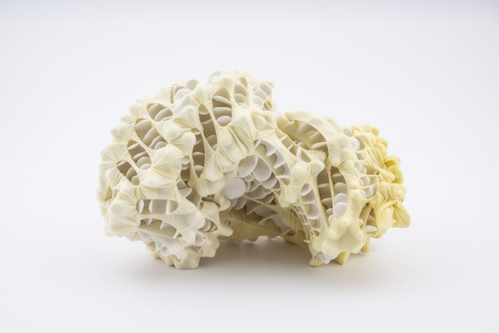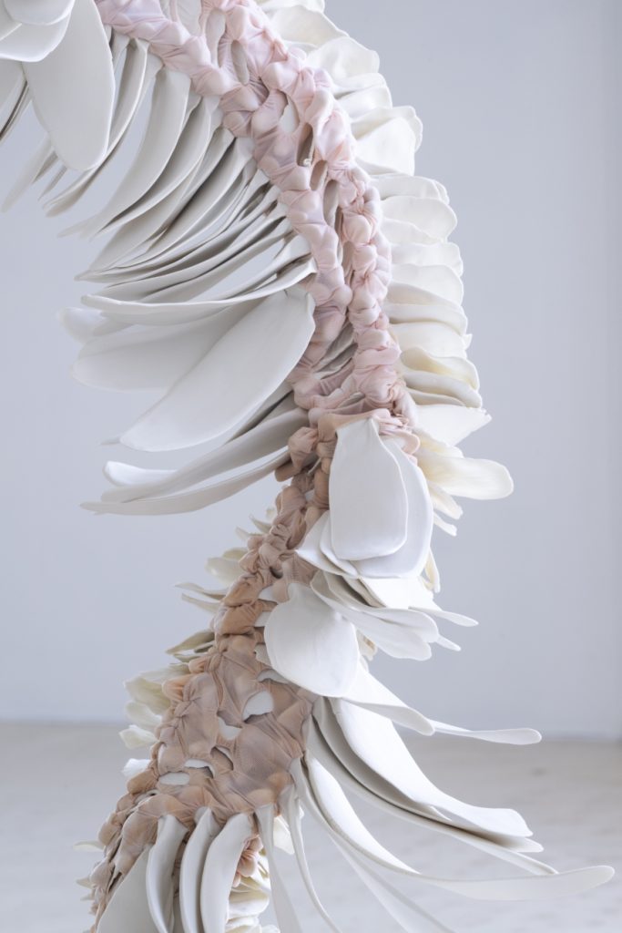 In the process of making she creates small modular porcelain elements by hand, that are then tied into hand dyed semi-transparent nylon fabric to construct larger forms. Using textiles and porcelain, she works with two materials that are easy to identify and familiar to us in our everyday lives, yet allow for transformation in a way that they appear unknown or new. The material hybrids are made from hard and soft elements, with the porcelain resembling the presence of bones and the textile as the sculpture’s skin. Together they form a skeletal structure in which both materials create a cohesive whole, akin to the inner functionality of living beings. Because of the dynamic tension between the two materials, they give the impression of being alive—almost as if they are breathing, expanding, and contracting.