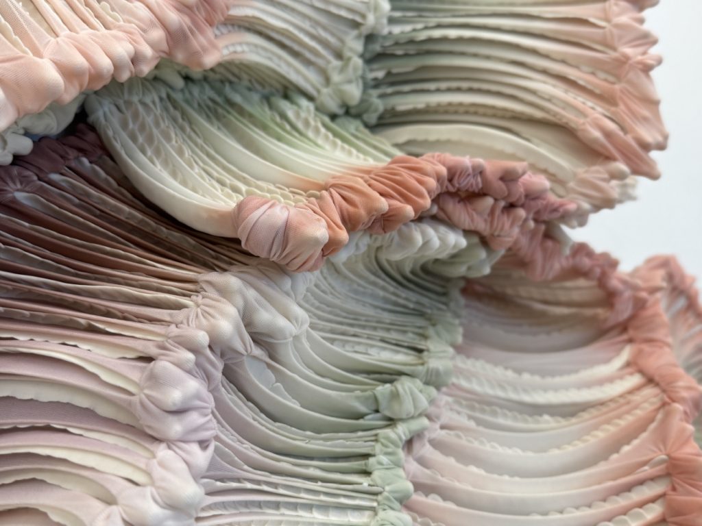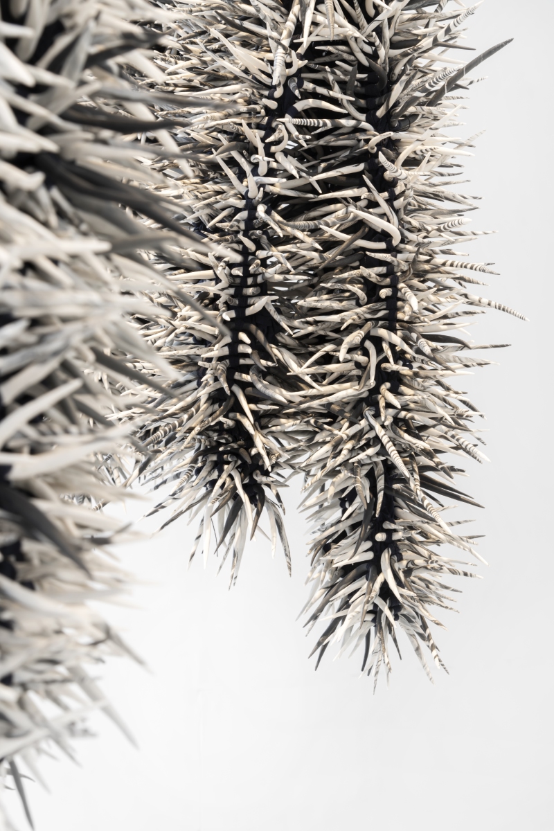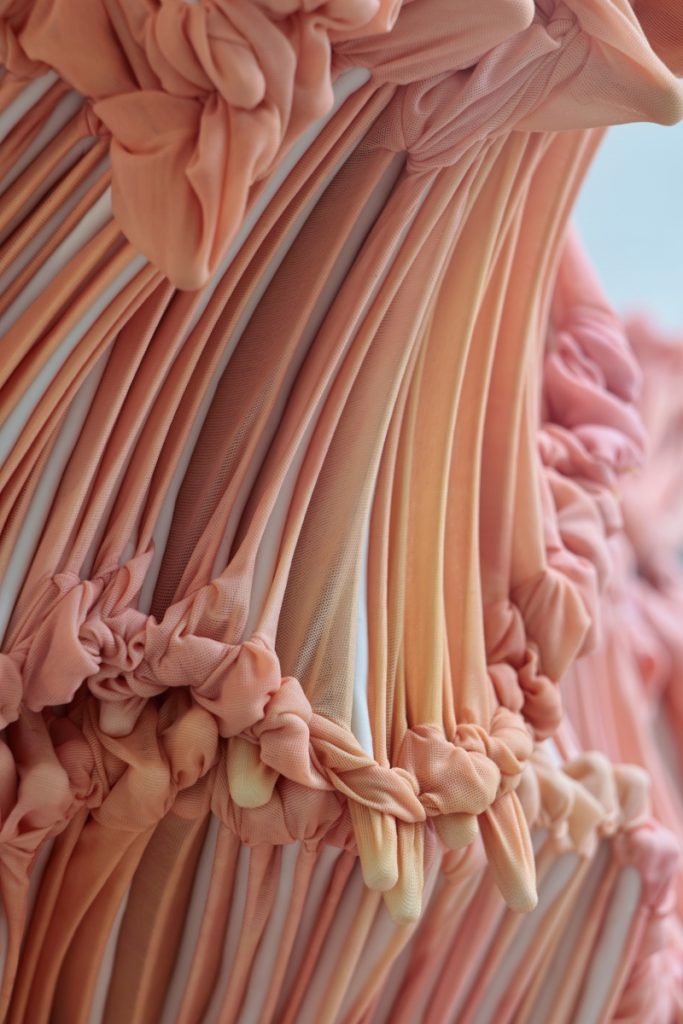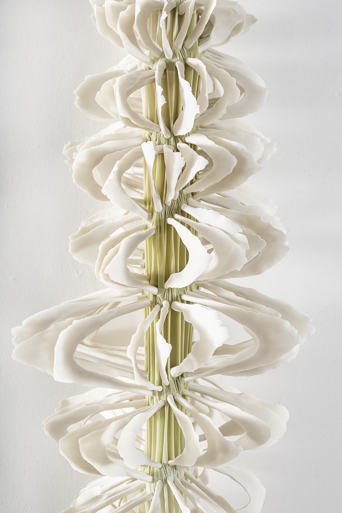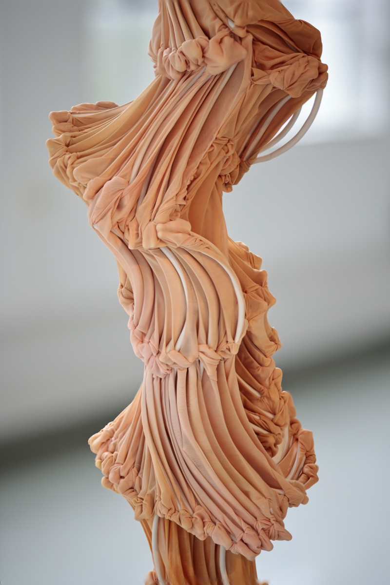Gewächs IV (Detail), 2025, dyed nylon fabric, hand formed porcelain, tied, 190 x 95 x 20 cm, photo Ingjerd Kleivan, Format