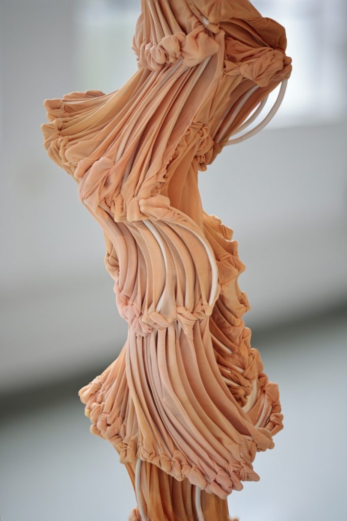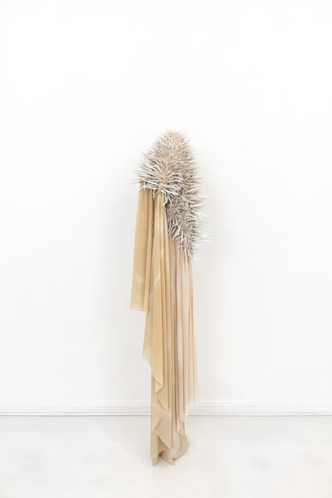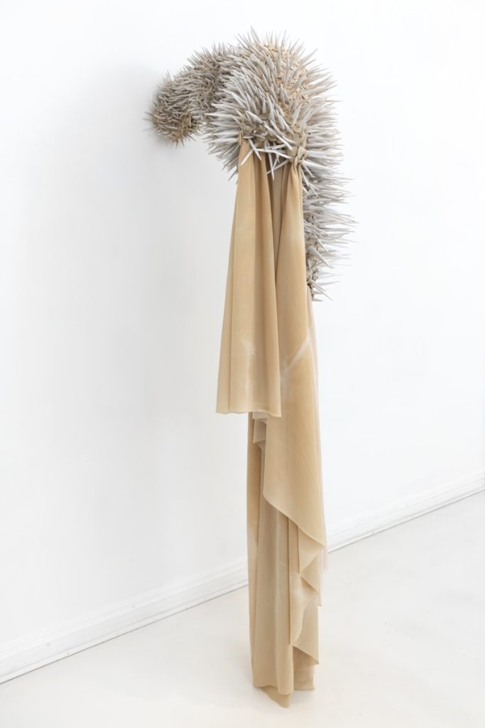 Hybridia II, 2020, dyed polyamide fabric, tied-in hand shaped porcelain elements, 175 x 70 x 40 cm, Photo Øystein Thorvaldsen