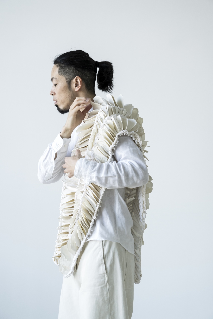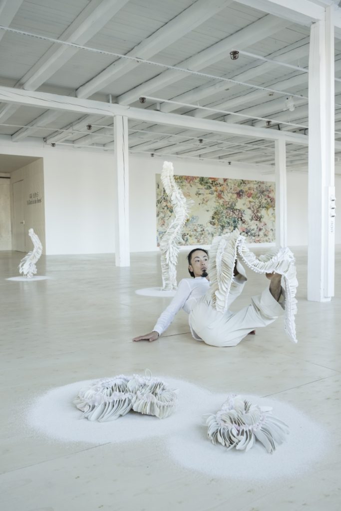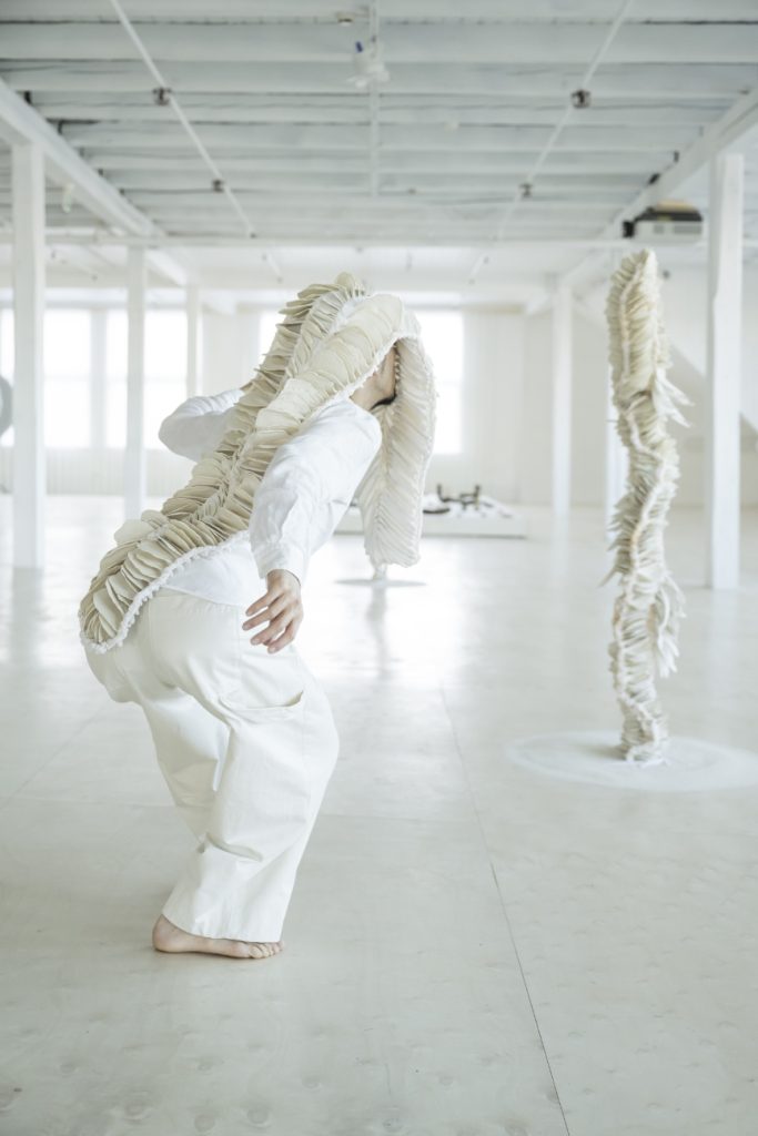 Performance by dancer Yohei Hamada in dialogue with the works of Daniela Bergschneider, Gyldenpris Kunsthall 2025, Photo Thor Brødreskift - Oriri, 2022, Dyed nylon fabric, hand shaped porcelain elements tied, 200 x 80 x 90 cm, 240 x 70 x 70 cm, 180 x 80 x 80 cm, Work on the left acquired by National Museum Oslo, Photo Thor Brødreskift