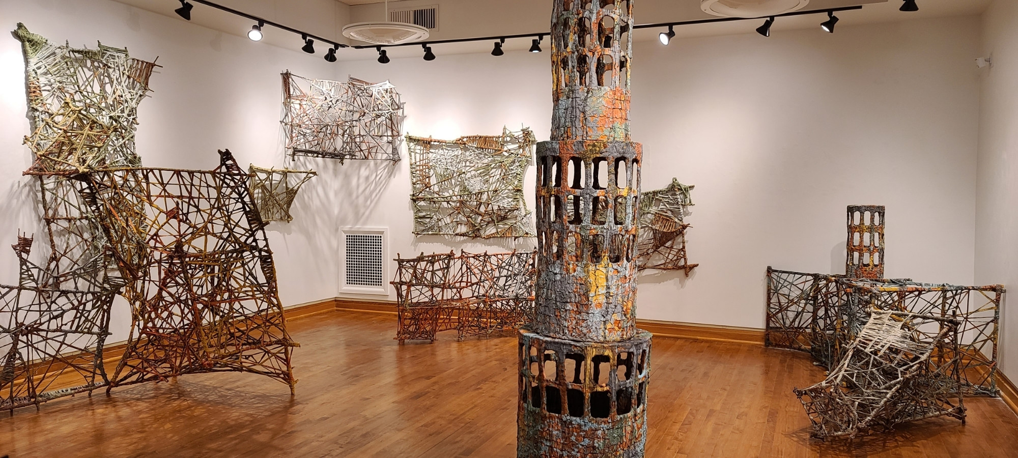 - Where the Deer and the Antelope Played, 2024, Handbuilt Earthenware Paper Clay, Unfired Adobe Clay, Bound Willow Branches (locally and ethically sourced), Woven Up-cycled Fabric (bedsheets) with Unfired Adobe Clay, Up-cycled Latex Paint, Up-cycled Tempera Paint, Oxides, installed in 15’ x 15’ gallery. This installation highlights iconography of the western landscape that is representative of the need for healthy boundaries with the natural world, so the Earth can heal from the wounds humanity continues to inflict on it. Fences, property markers, and scars on the land (from extraction processes) are as integrated into the western landscape as flora and fauna. They act as boundaries and barriers that protect, block, identify, guide and contain. They are also representative of colonization and the devastation that colonialist values bring to the land. According to Canadian researcher Max Liboiron, “pollution is not a manifestation or side effect of colonialism but is rather an enactment of ongoing colonial relations to the land.” This installation is a call for an anti-colonialist approach to the present-day eco-emergency.