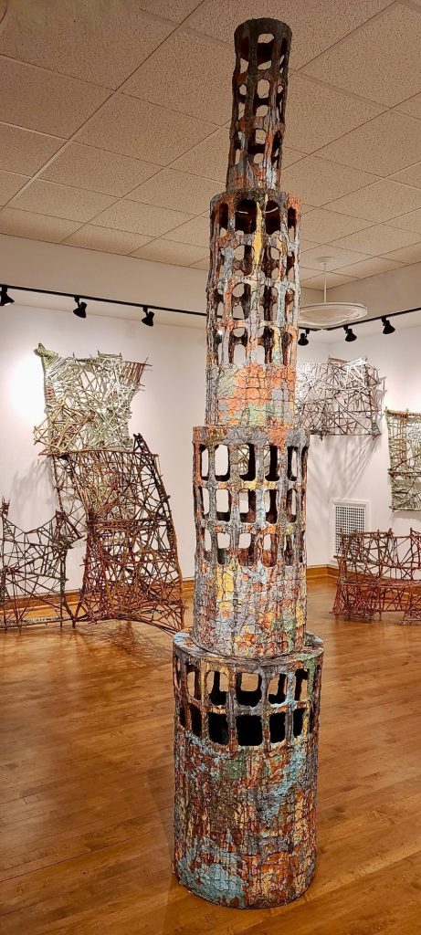 - Caged, 2021, Handbuilt and Woven Paper Clay (Earthenware), Zip Ties, Up-cycled Draperies, Adobe Paper Clay with Oxide/Gouache, Sodium Silicate with Oxide Stains, Rust Dye, Coffee Dye, 5.75’ x 3.5’ x 3.5’. This monumental piece references traps that I find discarded and washed up on the beach. It alludes to the fact that we are as much the victim as the earth is through our misuse and abuse of the natural world.