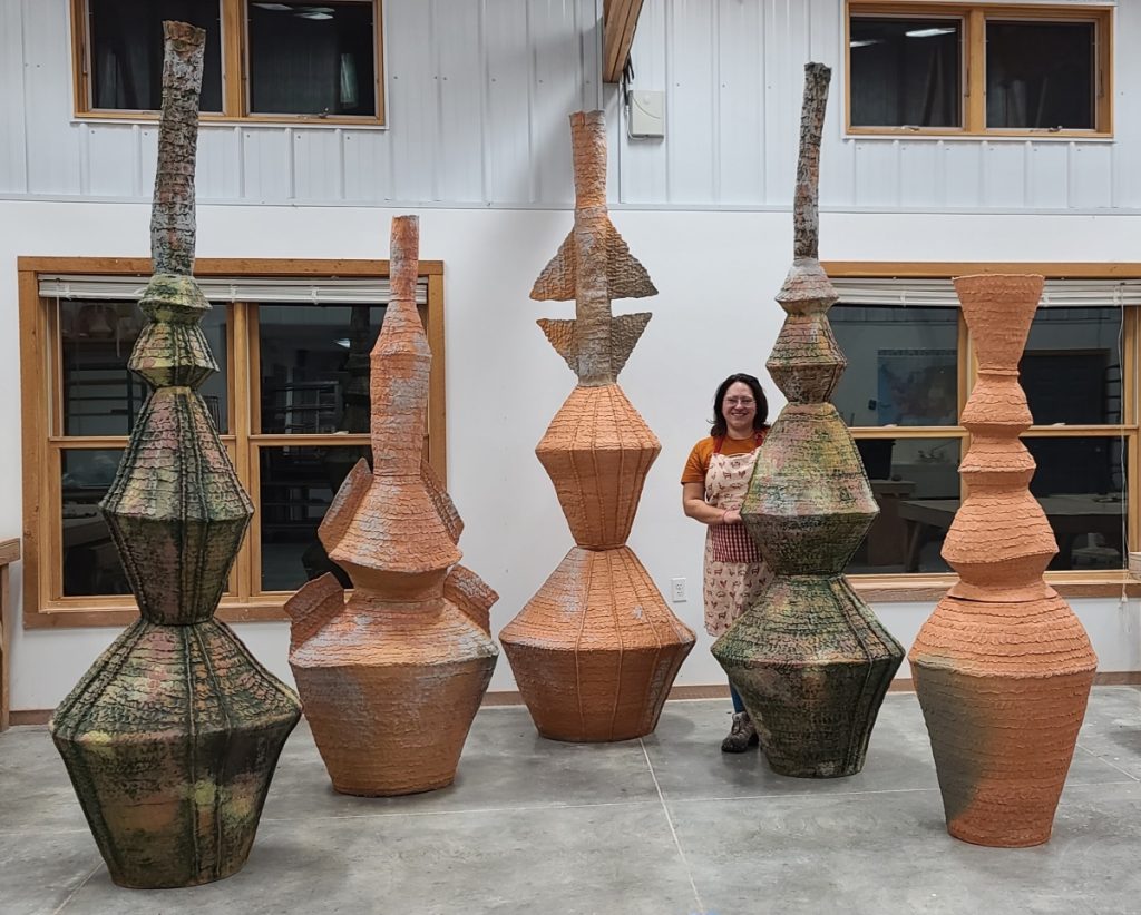- Smoke Stacks, 2023, Fired Paper Clay, Tempera & Latex Paint, Adobe Clay, 10’ x 15’ x 8’. By using iconography from the western landscape that is indicative of wide-spread carbon footprint, this installation will be a call for viewers to start relying on locally available resources in order to reduce greenhouse emissions.