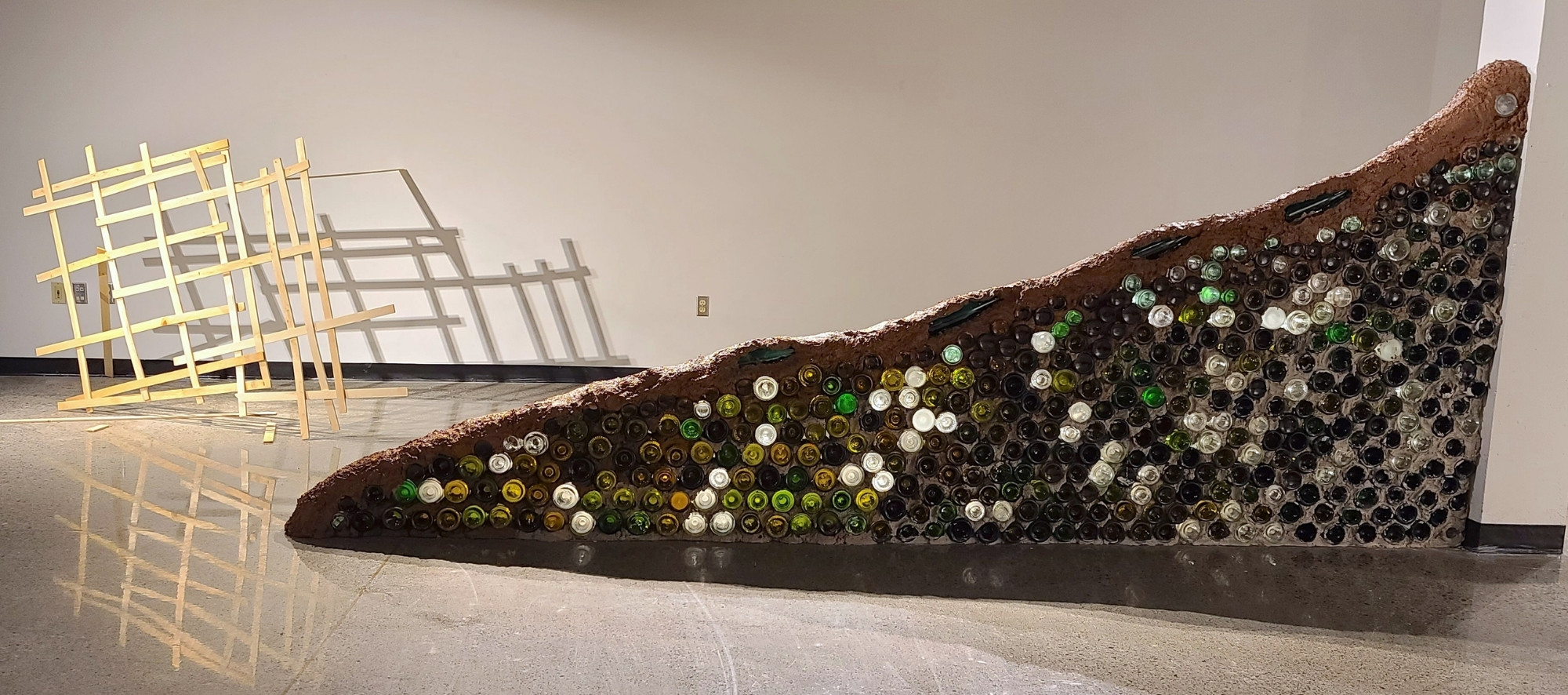 - Where the Buffalo Roamed, 2024, Up-cycled Glass Bottles (gathered from a local wine shop), Unfired Adobe Clay, Wood, 5.5’ x 14’ x 1.5’. The piece highlights the negative consequences of our consumeristic culture by showing how our waste products are becoming integrated with the land. Human-made substances outweigh natural materials.