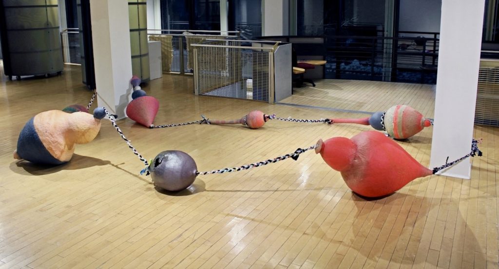 - Sink or Swim, 2021, Handbuilt Earthenware, Porcelain, Stoneware, Woven Electrical Wire, Knit/Crocheted Fishing Line, Handmade Paper (Up-cycled Clothing + Locally Sourced Plants), Antique Hooks, Rust Dye, 7’ x 3’ x 2.5’. It is common to encounter piles of retired, discarded buoys in coastal regions – making one think of litter, pollution, and wastefulness. This piece references overconsumption and it symbolizes our need to be more resourceful with materials that are locally available (upcycle/reclaim) as this buoy-like cluster is lashed together with discarded materials.