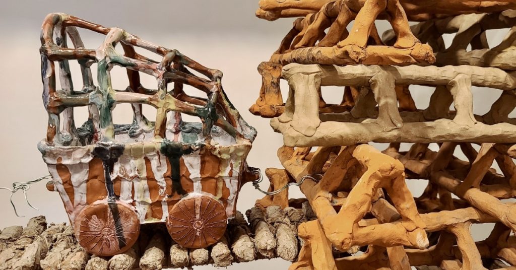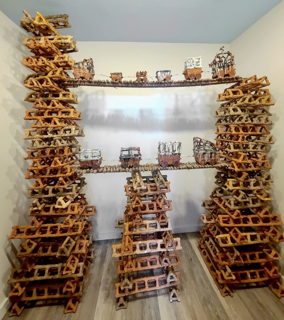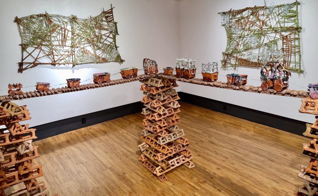 - Materials in Motion #2, 2023, Handbuilt Earthenware with Majolica and Up-cycled Electrical Wire; Handbuilt Earthenware/Stoneware Trestles with Rust Dye, Charcoal, Drawing Ink; Tracks lashed to Wooden Board, 9’ x 6’ x 2.5’. This piece utilizes iconography from the western landscape that symbolizes wide-spread carbon footprint (as trains and mining carts are used to move materials from their point of origin to world-wide destinations). It is a call for people to rely on locally available resources in order to reduce greenhouse emissions.