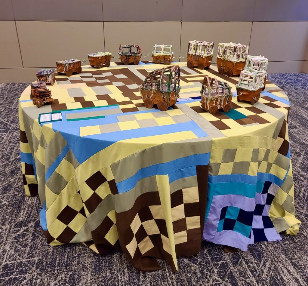 - Materials in Motion #3, 2023, Handbuilt Earthenware with Majolica Glaze, Up-cycled Electrical Wire, displayed on Hand-stitched Up-cycled Bedding Quilt, 2.5’ x 8’ x 8’. This piece utilizes iconography from the western landscape that symbolizes wide-spread carbon footprint (as trains and mining carts are used to move materials from their point of origin to world-wide destinations). It is a call for people to rely on locally available resources in order to reduce greenhouse emissions.