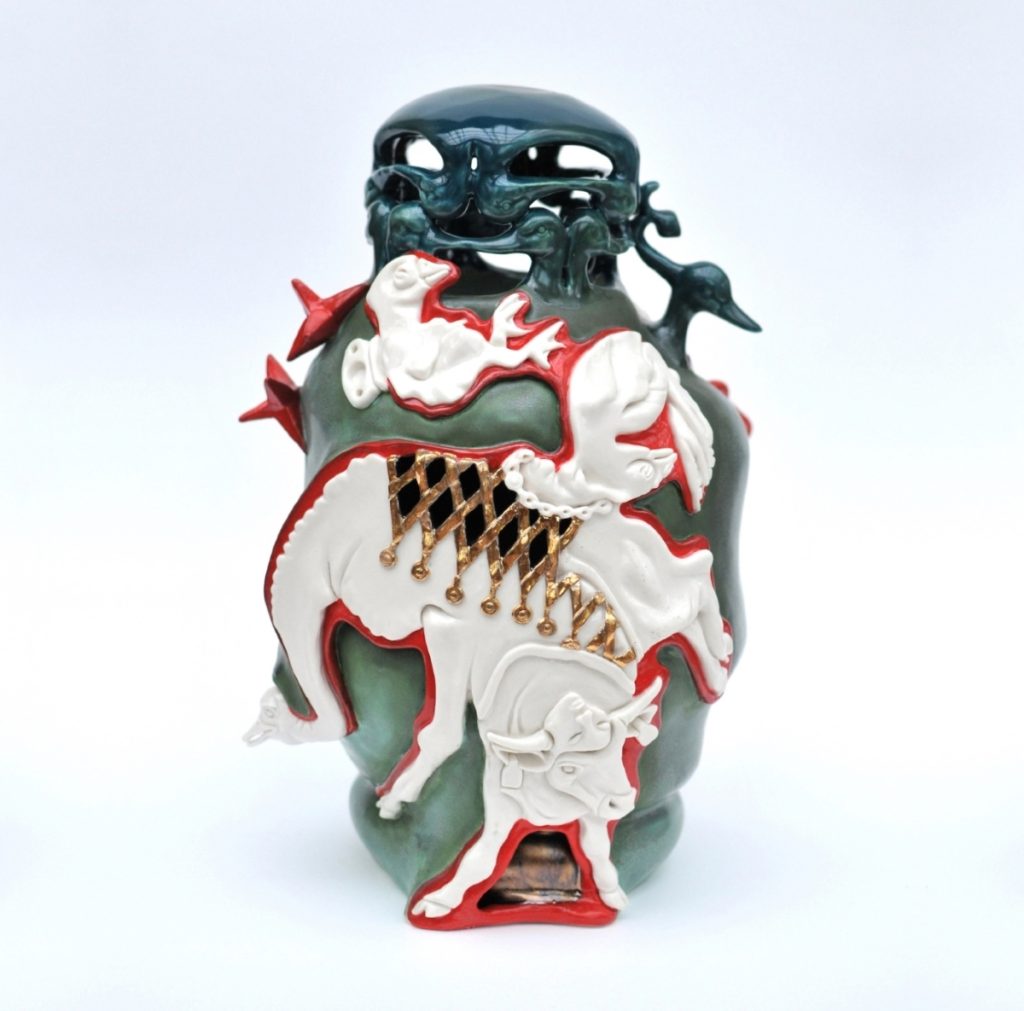 Hennigar’s sculptural vessels are hand-built and adorned with relief carvings and cast details of vernacular objects such as deer hooves, peach pits, puzzle pieces, electric fencing insulators, tools, and toys. Animals are often rendered in ambiguous states of metamorphosis, hunt, or performance. The work’s layered surfaces are built through multiple firings and often incorporate metal components. In two-dimensional works, the carved porcelain imagery is mounted on metal. Employing jeweler’s techniques on a large scale, these works resemble engraved charms. Referencing objects of protection and historical depictions of infernal and sublime landscapes, they imagine possibilities of connection between wild and domestic realms, between chaos and play, and hybridity as an emblem of resiliency.