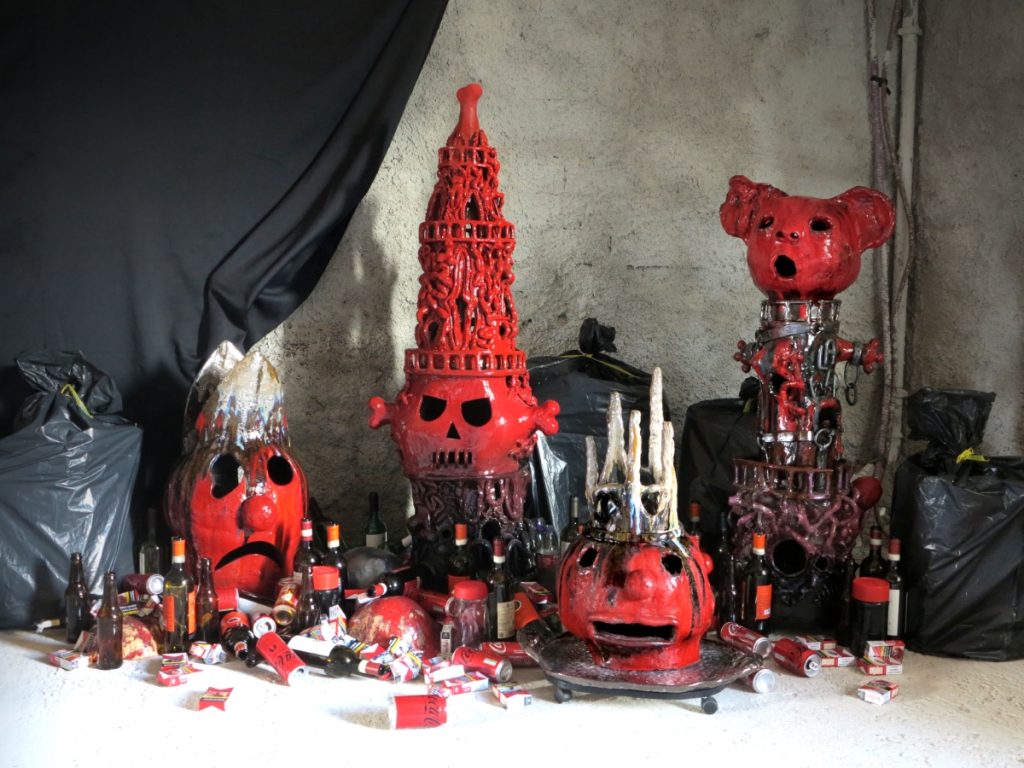 As an imperfect blend of art brut and popculture, of fanciful and even fantastical grafts of figures, icons and totems, the installation asserts a vulnerability that is imbued with naivety in the choice of forms and media, selected for their physical and symbolic qualities, and is in keeping with a definition of contemporary art as precarious.