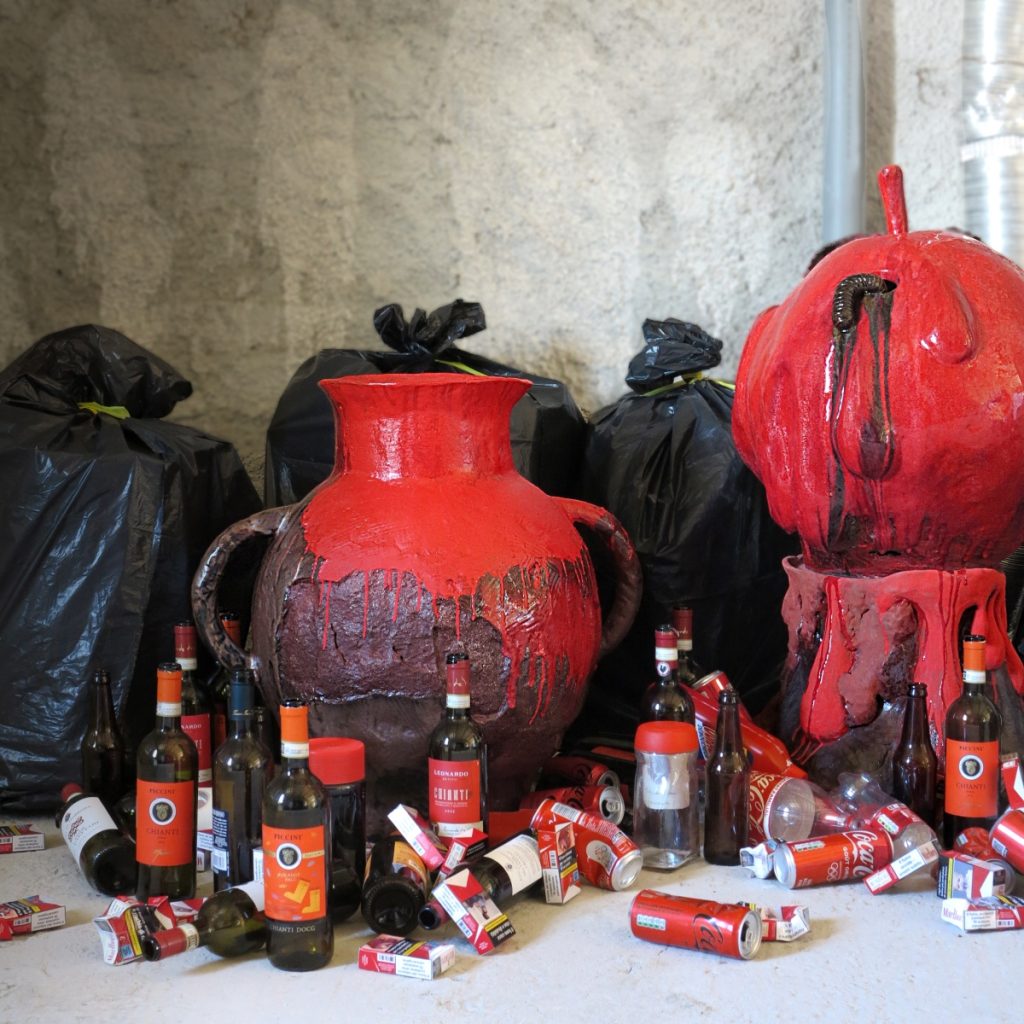 - The fallen bodies land – Worries, Amphora and Dead Apple, 2023, glazed stoneware, trashes, 100×180 cm