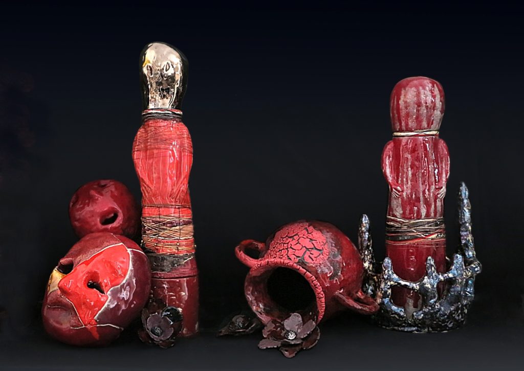 - The Banquet, Red Virgin, 2024, glazed stoneware, threads, 45x20x20 cm