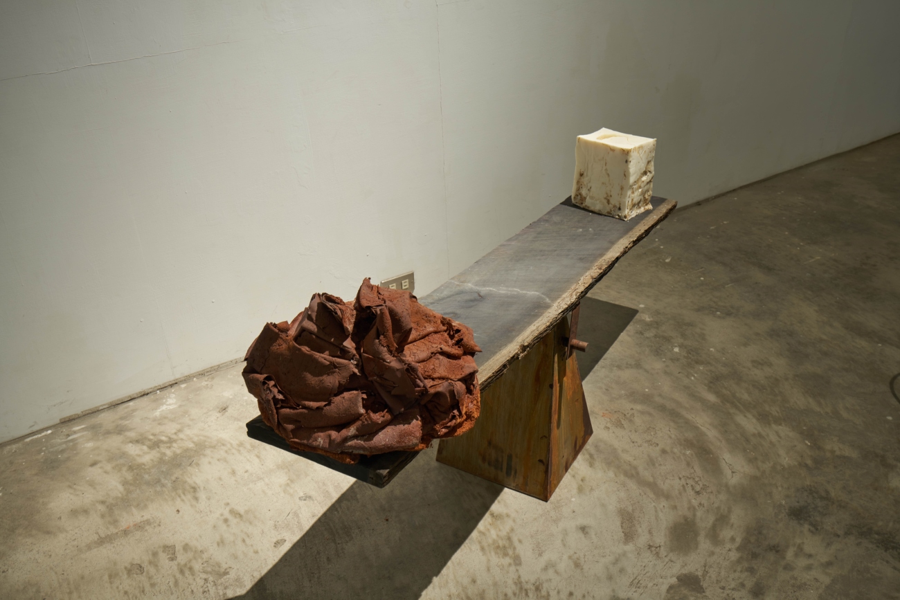 with-out A ̶s̶ ̶o̶ ̶u̶ ̶n̶ ̶d̶ #4, Installation, 2022, terra cotta, wax, wood and iron, 140x35x70H. Photo credit: Jason Goh